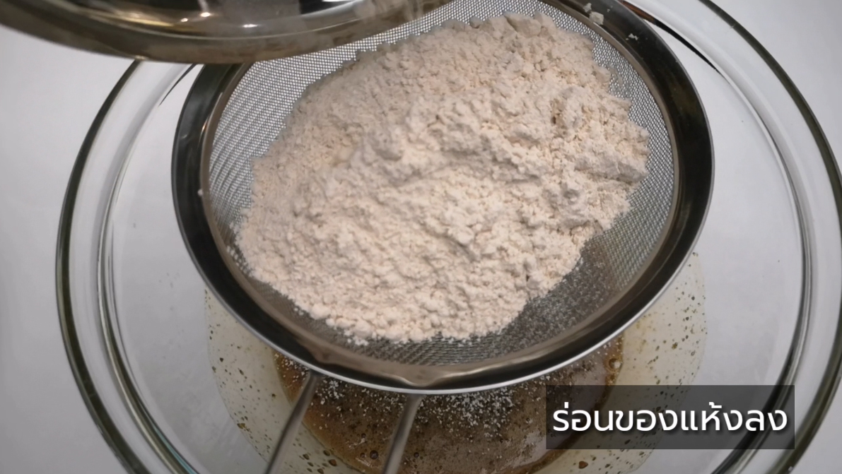 ร่อนแป้ง+ผงฟู+เบกกิ้งโซดา+เกลือ+อบเชยป่นลงไป