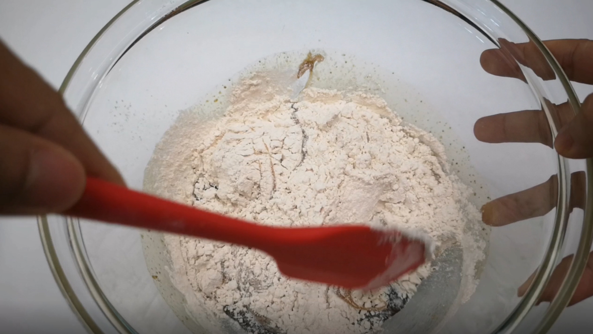 นำแป้ง ผงฟู เบกกิ้งโซดา ผงอบเชย ผสมรวมกันแล้วพักไว้