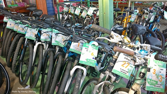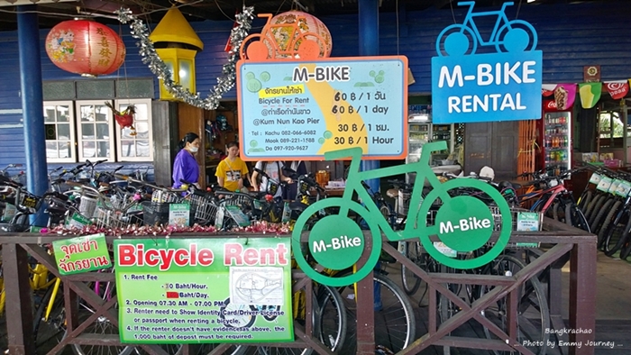 พอข้ามฝั่งมาถึงท่าเรือกำนันขาวก็เจอร้านเช่าจักรยานเลยจ้า เราเช่าแบบเหมาทั้งวัน ราคาคันละ 60 บาท จ่ายเงินไปพร้อมวางบัตรประชาชนทิ้งไว้ด้วย พอเอาจักรยานมาคืนก็ค่อยเอาบัตรประชาชนคืนนะ