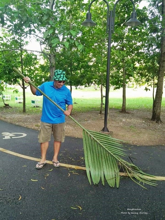 จุดหมายที่ 1 ของเรา คือ สวนสาธารณะและสวนพฤกษชาติศรีนครเขื่อนขันธ์ ปั่นเข้าไปก็เจอเจ้าหน้าที่กำลังกวาดใบไม้โดยใช้กิ่งของใบจากมากวาดแทนไม้กวาด เราเลยของลองกวาดบ้าง