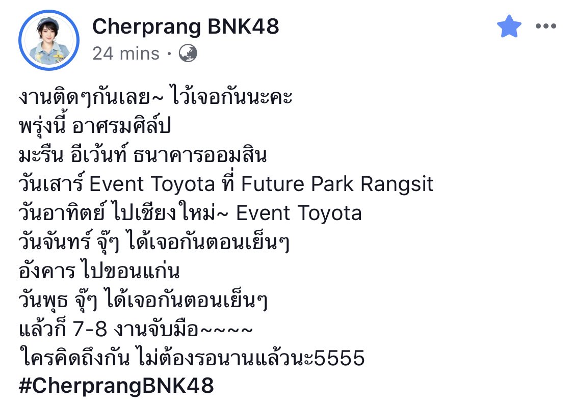 จากที่เฌอปรางมาโพสตารางงานไว้ในเฟส สามารถไปเจอได้ทุกวัน ไปทั่วประเทศเลย