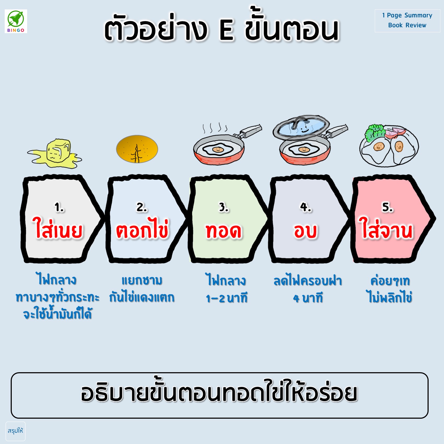 ส่วนแผนภูมิขั้นตอนจะช่วยให้เรามองเห็นกระบวนการในภาพรวมได้ดีมากขึ้นกว่าการเขียนหรือพูดเยอะมาก (สังเกตซ้ายกับขวา)