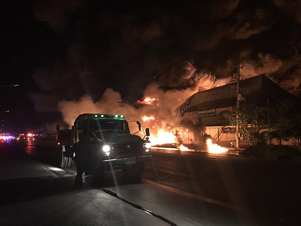 สูญกว่า 100 ล้าน! ไฟเผาโกดังเก็บน้ำมันเครื่อง อะไหล่รถหลายประเภท ชื่อดังชัยภูมิ ระดมดับเพลิงข้ามคืน ปิดตายการจราจรถนน 201 สายชัยภูมิ-สีคิ้ว ล่าสุดผู้ว่าฯขอกำลังเสริมรถดับเพลิงเคมีจาก ปภ.เขต 5โคราช และ ปภ.เขต 6 ขอนแก่น เข้าช่วย คาดค่ำนี้ควบคุมเพลิงได้หมด เบื้องต้นสูญกว่า 4 คูหา พื้นที่กว่า 3 ไร่