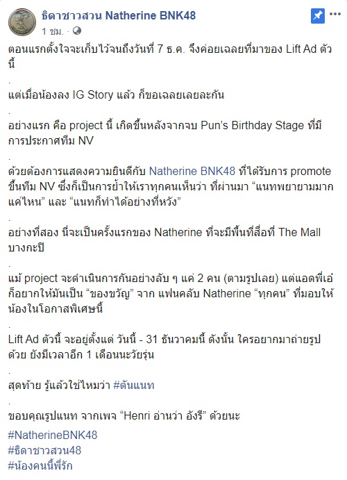 เดือน พย เราได้เห็นป้ายอวยพรวันเกิดของน้องแนทตลอดเดือน เดือนธันวาคมนี้ เราก็ได้เห็นป้ายแสดงความยินดีที่น้องติดทีม NV ด้วย
