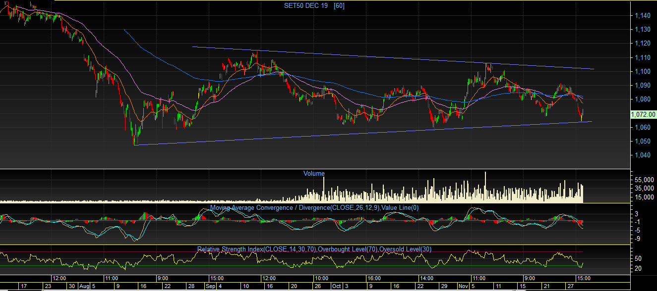 ดัชนีได้ร่วงลงมาพักตัว ณ บริเวณ Support line พร้อมกับสภาวะ Over sold ของ Indicator บางตัว จึงทำให้เห็นการฟื้นตัวของดัชนี (Technical Rebound) ในช่วงบ่ายวันศุกร์ ซึ่งต้องมาดูกันว่าจะสามารถกลับไปทดสอบ High 1090 ได้หรือไม่ ถ้าหากไปถึง และ เคลียร์ผ่าน ก็มองว่ามีโอกาส