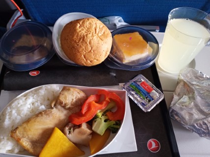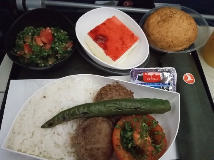 มาตรฐาน full service airline มี อาหาร 2 มื้อ มื้อแรกจะมีเมนูมาให้เลือก เป็นไก่ หรือ เนื้อ บางที ก้ปลา หรือ เนื้อ แล้วแต่ ไฟล์ท แต่มื้อที่ 2 ก่อนลงประมาณ 2 ชั่วโมง ไม่มีให้เลือก ได้เป็น meetball !!!! และเราก็ไม่ทานเนื้อ ดังนั้นเวลาทำจองก็ระบุไปเลยว่าไม่ทานเนื้อนะคะ ส่วนเครื่องดื่มก็มีครบ เหล้า เบียร์ ไวน์ น้ำผลไม้ น้ำอัดลม เราก็ไม่ดื่มอีก สั่งแต่น้ำผลไม้ รู้สึกขาดทุนนิดหน่อย 555