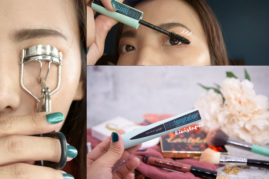 ดัด – ปัด เพื่อที่จะติดขนตาปลอม โดยปายเลือกใช้ มาสคาร่าของ Mabelline Total Temptation สีฟ้า
