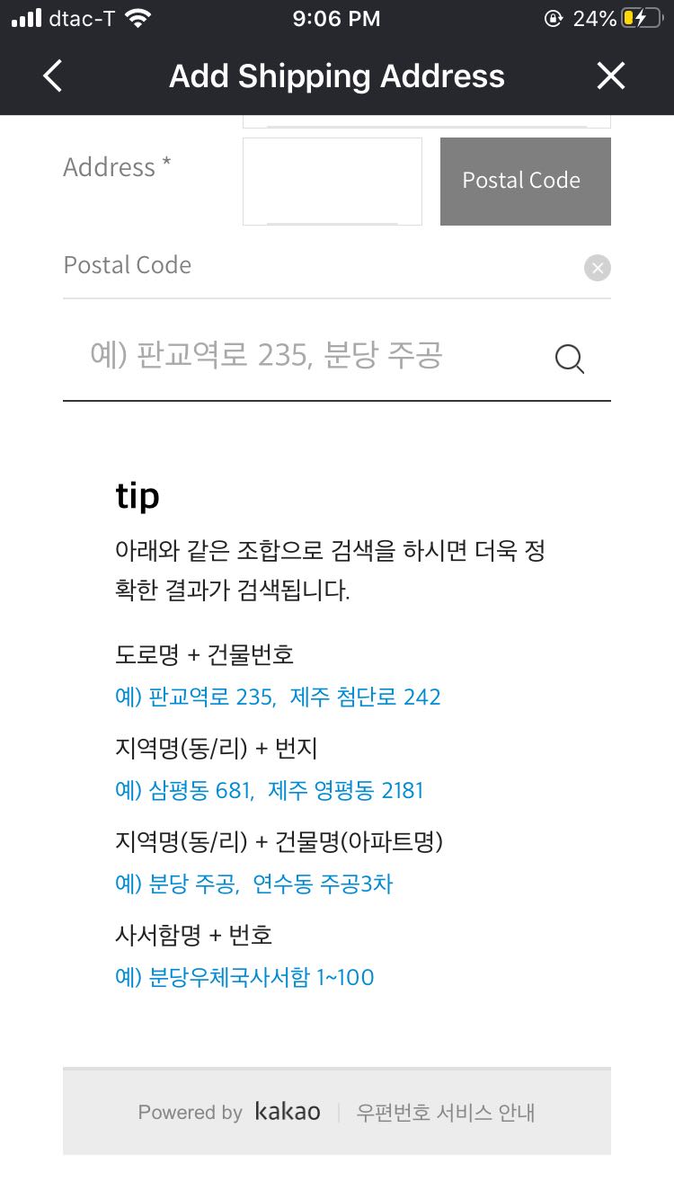 เราอยากช้อปปิ้งเว็บเกาหลีเว็บนึงค่ะ โดยต้องล็อกอินกับ Kakao Talk แต่เราใส่ที่อยู่ในแอพไม่ได้ค่ะ ติดตรงรหัสไปรษณีย์ตลอดเลย ใครทราบขอคำแนะนำหน่อยนะคะ