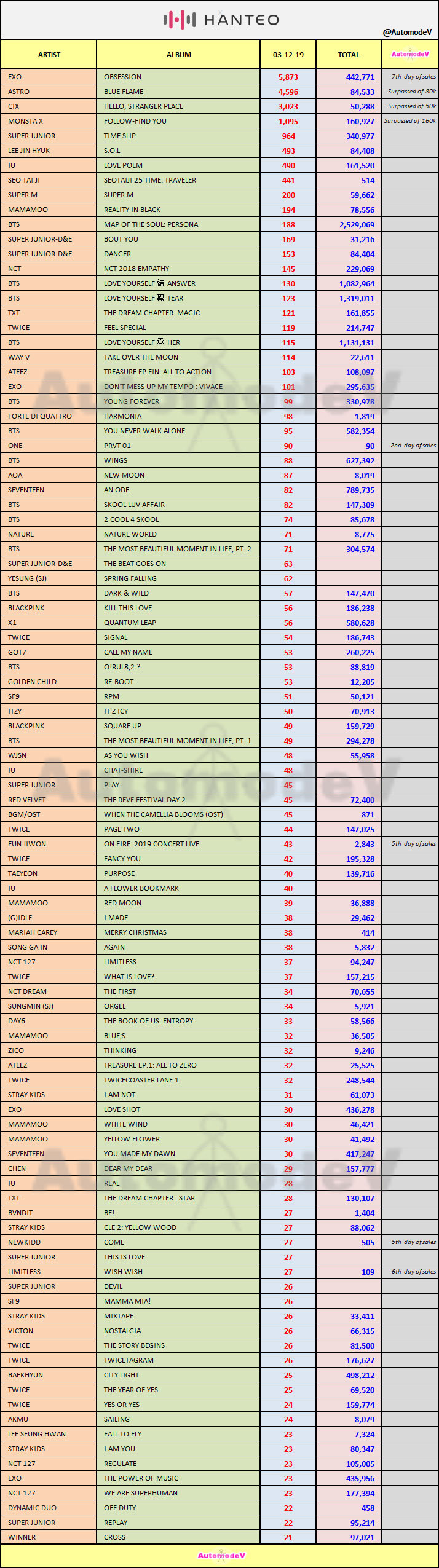 ยอดซื้ออัลบั้มจากชาร์ต HANTEO 3 ธันวาคม 2562 + EXO + HIGHEST 1st WEEK