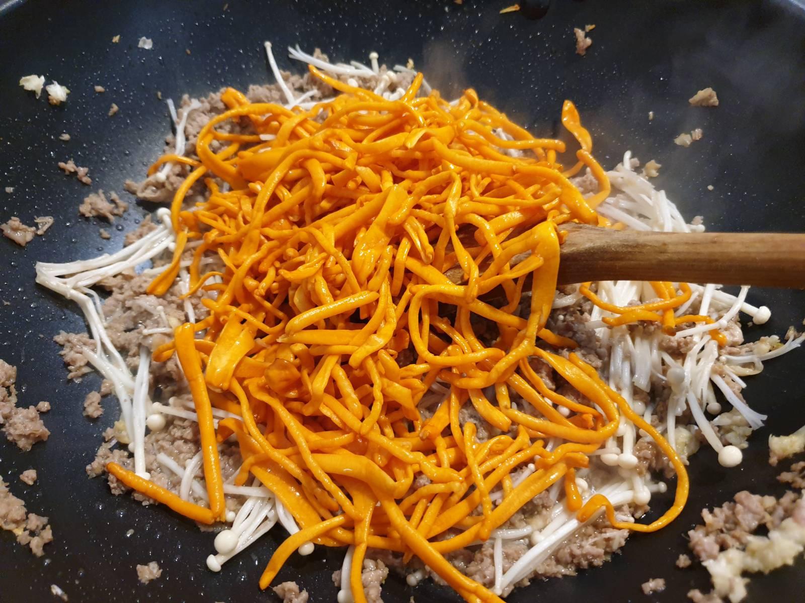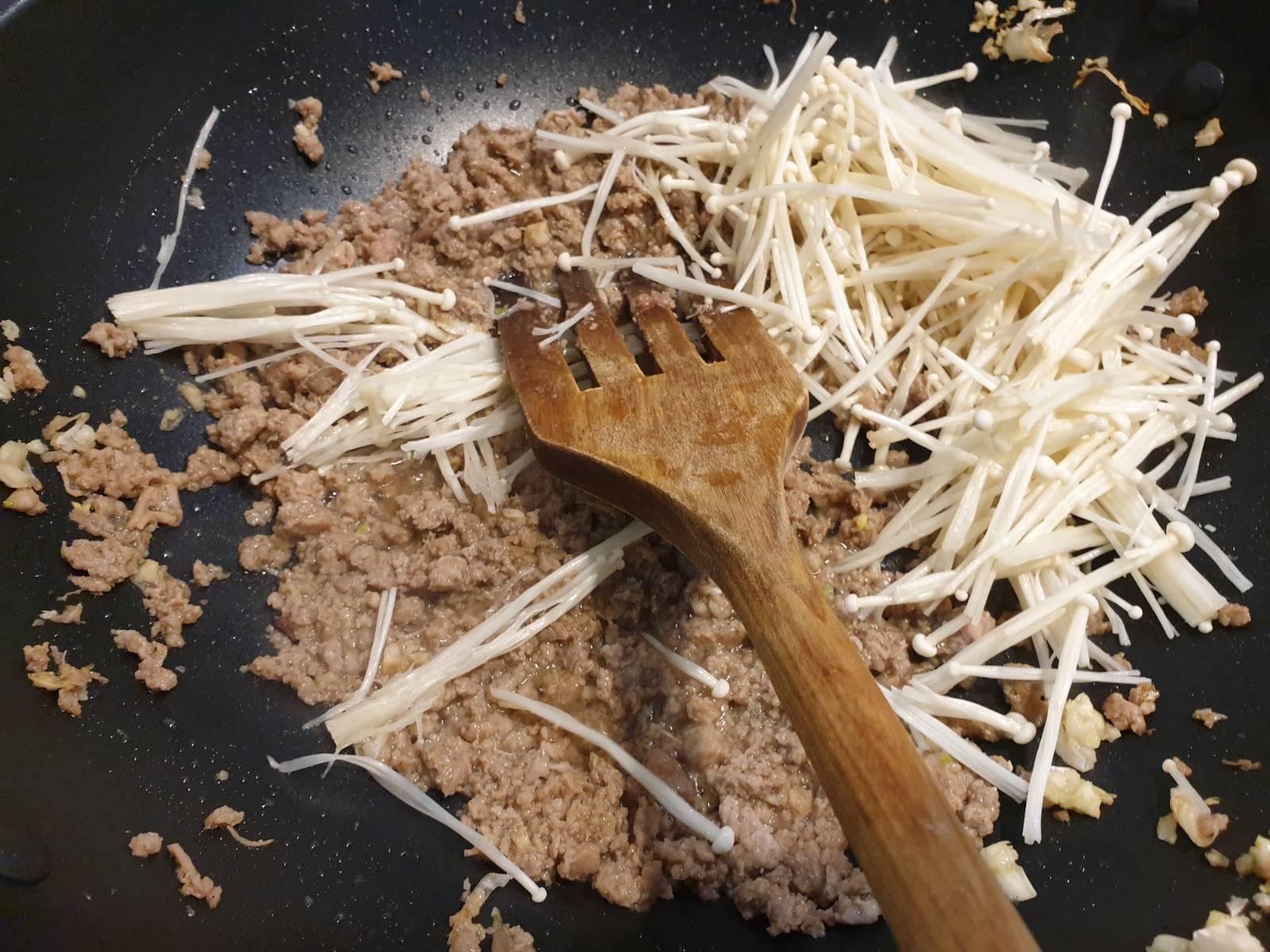 2.เตรียมเอาเนื้อสับ เห็ดเข็มทอง (เหลือจากในตู้เย็นเลยเอามารวมกัน) เห็ดถั่งเช่าสีทอง ราคาไม่แพง หาซื้อได้ที่แมคโคร เห็ดกรุบๆ กำลังดี