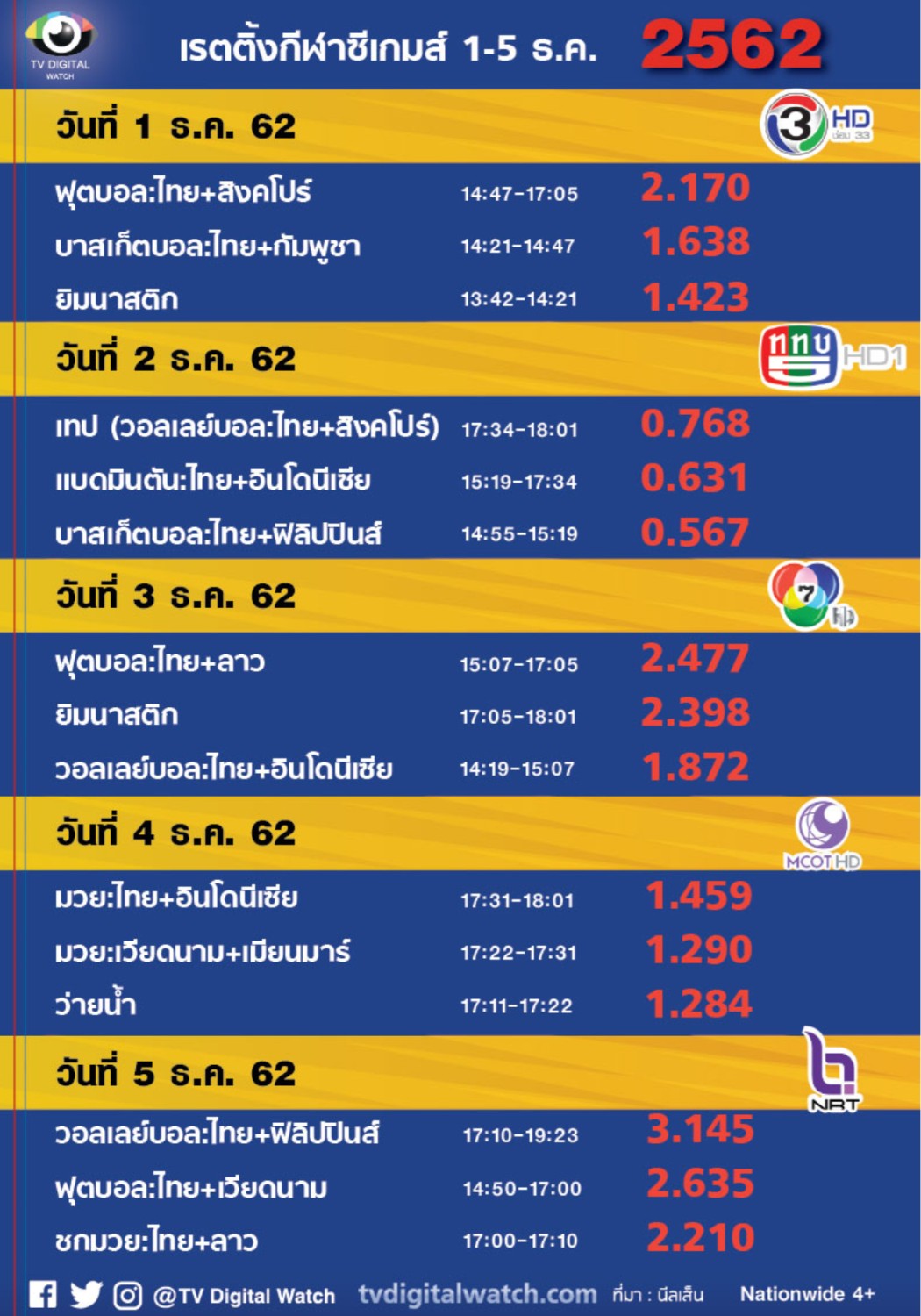 เรตติ้งเฉลี่ยประจำวันพ่อแห่งชาติ 5 ธันวาคม 2562 + ซีเกมส์