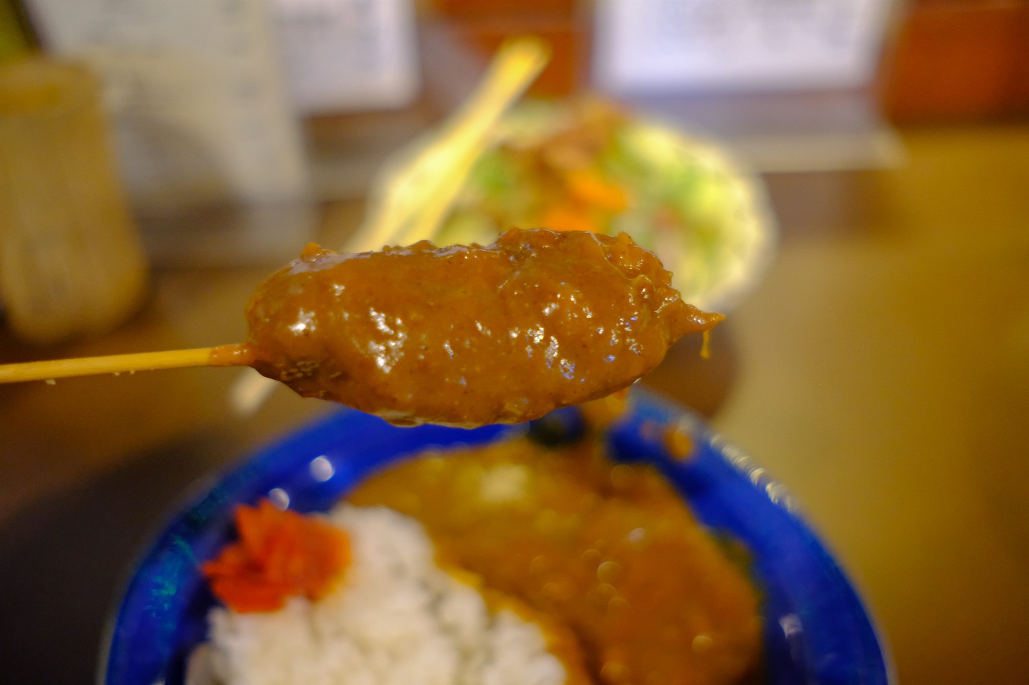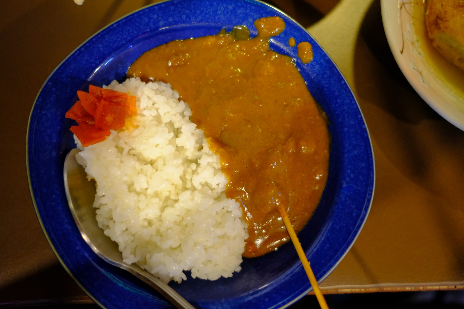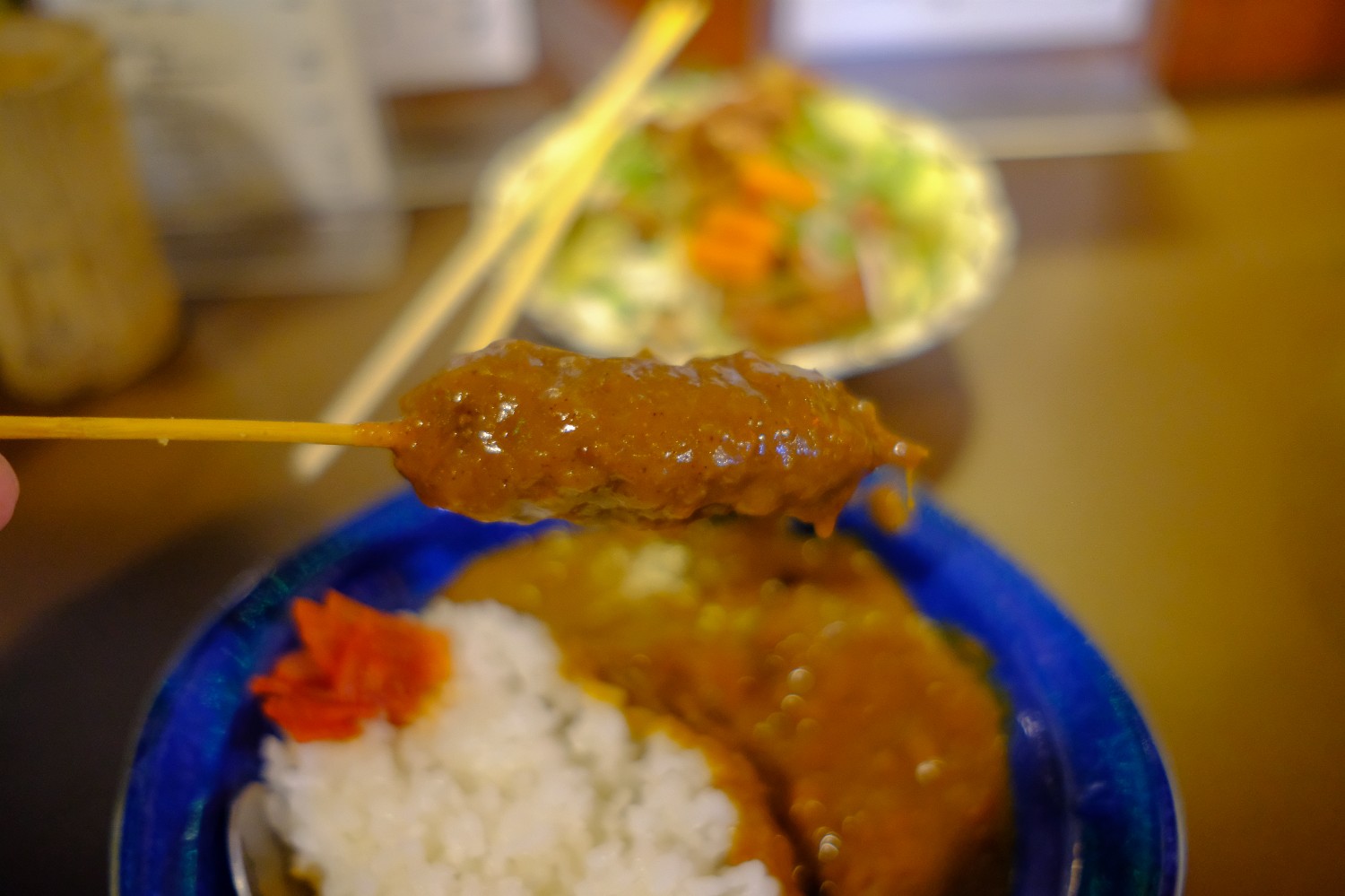 ข้าวแกงกะหรี่เนื้อ ที่เสียบไม้มาน่าจะเป็นหมู จานนี้น่าจะ 80 บาท แต่เค้ามีแบบจานใหญ่มาก น่าจะ 200 บาท แต่ต้องสั่งเค้าต่างหาก จานเบ้อเร่ิ่ม กินเก่งๆ ก็อาจจะสู้ไหว