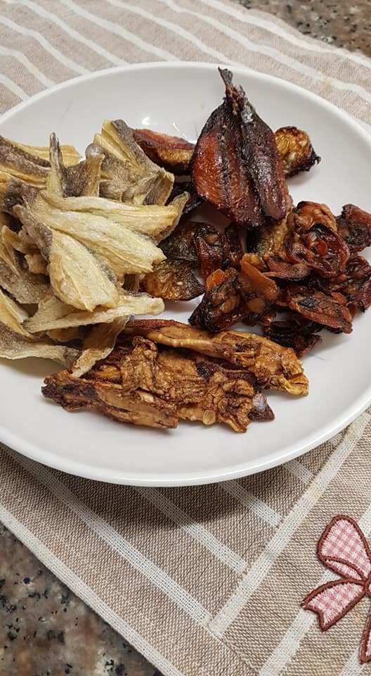 ปลากระเบนหรือปลาวง ปลาหมึกหอม หอยแมงภู่แห้ง และปลาหวาน ทอดในน้ำมันไฟกลางๆ