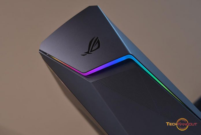 ด้านบนนั้นจะเป็น USB A 3.1 ด้วยมาให้ทั้งหมด 2 ช่อง และมาพร้อมรูหูฟังตอบโจทย์ได้เป็นอย่างดีไม่ต้องเสียบด้านหลังและใช้งานได้ง่ายมากๆ รวมถึงปุ่มเปิดปิดอยู่ในขอบข้างๆนิดหน่อยตามที่เห็นในภาพ และมีไฟเวลาเปิดใช้งานครับ รวมถึงมีเว้าลงไปสำหรับวางมือถือเวลาเสียบเสายอะไรไม่เลื่อนลงมาด้วยอันนี้ถือว่าสะดวก ส่วนในด้านหน้านั้น จะเห็นโลโก้ ROG แต่ไม่มีไฟตรงโลโก้นะครับ จะมีไฟตรงช่องแถบข้างล่างโลโก้แทน และมีลวดลายเล่นกับพื้นผิวสวยงามและเป็นช่องระบายลมเข้าด้วยนั้นเอง ดีไซน์นั้นถือว่าสวยงามและทำได้ดีทั้งในด้านหน้าและด้านบนของเคส