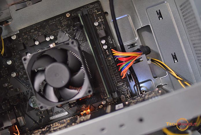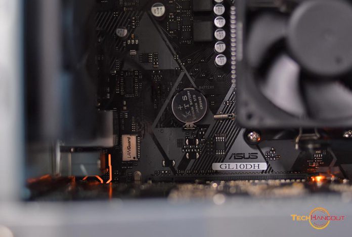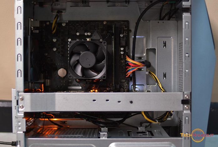 เมื่อเปิดฝาในด้านซ้ายนั้นจะเป็นเมนบอร์ด ASUS Prime B450M-K AMD ขนาดน่ารักๆพร้อมไฟสีส้มนิดหน่อยในมุมซ้ายเครื่องครับ และ จะเห็นตัวพัดลม CPU ขนาดเล็กๆพอใช้งาน ไม่ได้มีไฟหรือลูกเล่นอะไร พร้อมกับ สล็อต RAM ว่างอยู่อีก 1 ที่รองรับการอัพเกรดได้ และตัวเมนบอร์ดรองรับการเพิ่ม HDD ได้มากถึง 4 ลูกครับผม และที่สำคัญหรือตัวนี้มาพร้อมกับ Wifi Bluetooth อะไรครบๆในตัวไม่ต้องซื้ออะไรเพิ่ม ถือว่าเป็นจุดดีอีกอันเลยครับ