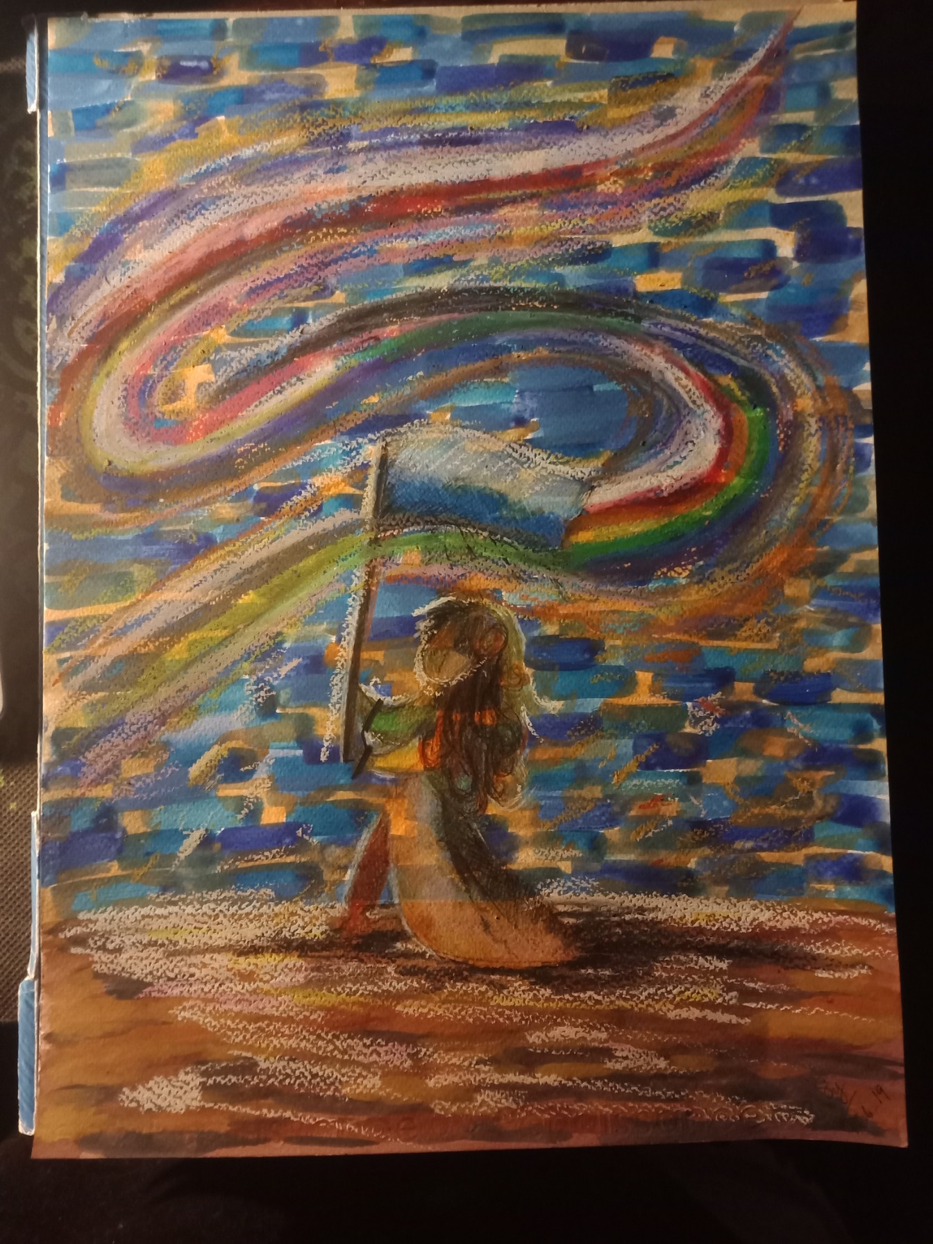 ใช่ฉันได้พูดถึงคนโบกธง ฉันขอถามว่าอย่างแรกว่าคุณดูออกไหมว่าฉันวาดเป็นคน และคุณดูออกไหมลักษณะของคนที่ฉันวาดเป็นเช่นไร ใช่อาจดูยากเพราะมันคือการซ้อนของความเป็นมนุษย์เอาไว้ในที่เดียว สภาพเพศ กาลเวลา ลักษณะผิวพรรณ สีผิว สีผม ลักษณะผม อาภรนที่แตกต่าง ทุกอย่างรวมเป็นหนึ่ง ไม่ใช่เพราะฉันขี้เกียจวาดเลยรวบรัด แต่เพราะฉันต้องการแสดงถึงจุดยืนของความเป็นหนึ่ง ความเท่าเทียมในทางสังคมที่ทุกวันนี้เห็นเรียกร้อยและเริ่มกล้าที่จะพูดมาบ้าง แต่เอาเข้าจริง ก็ไม่พ้นการเหยียดกันจนถึงตอนนี้ฉันก็ยังเห็นการเหยียดกัน การไม่ให้เกียรติ การไม่เคารพกันอยู่ถมไป มันเป็นเรื่องไม่ปกติที่ปกติในสังคม คงจะไม่มีอะไรเถียงได้ในข่าวที่แพร่กระจายให้เห็นอยู่ทุกวันหรอกจริงไหม