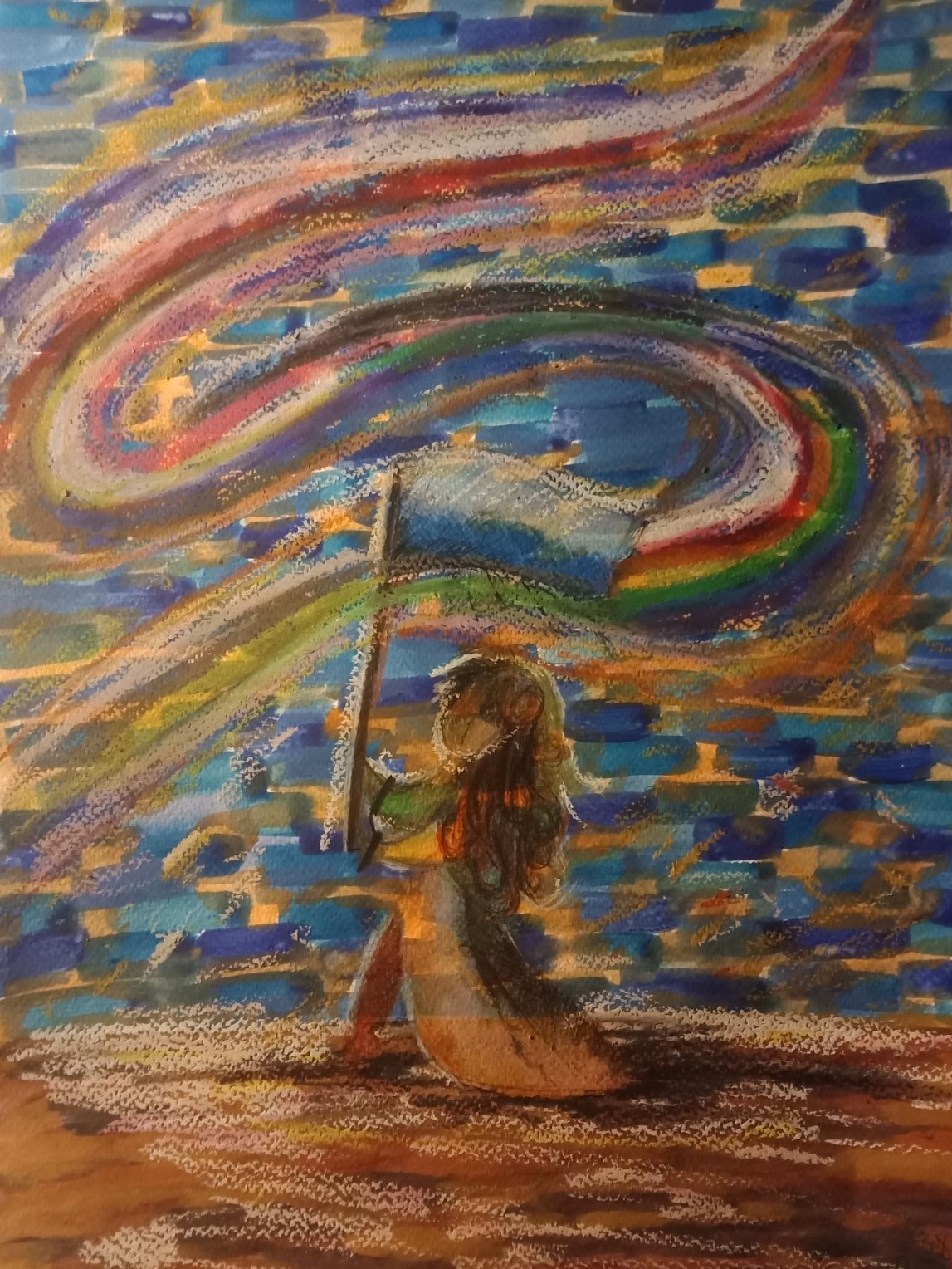 ใช่ฉันได้พูดถึงคนโบกธง ฉันขอถามว่าอย่างแรกว่าคุณดูออกไหมว่าฉันวาดเป็นคน และคุณดูออกไหมลักษณะของคนที่ฉันวาดเป็นเช่นไร ใช่อาจดูยากเพราะมันคือการซ้อนของความเป็นมนุษย์เอาไว้ในที่เดียว สภาพเพศ กาลเวลา ลักษณะผิวพรรณ สีผิว สีผม ลักษณะผม อาภรนที่แตกต่าง ทุกอย่างรวมเป็นหนึ่ง ไม่ใช่เพราะฉันขี้เกียจวาดเลยรวบรัด แต่เพราะฉันต้องการแสดงถึงจุดยืนของความเป็นหนึ่ง ความเท่าเทียมในทางสังคมที่ทุกวันนี้เห็นเรียกร้อยและเริ่มกล้าที่จะพูดมาบ้าง แต่เอาเข้าจริง ก็ไม่พ้นการเหยียดกันจนถึงตอนนี้ฉันก็ยังเห็นการเหยียดกัน การไม่ให้เกียรติ การไม่เคารพกันอยู่ถมไป มันเป็นเรื่องไม่ปกติที่ปกติในสังคม คงจะไม่มีอะไรเถียงได้ในข่าวที่แพร่กระจายให้เห็นอยู่ทุกวันหรอกจริงไหม