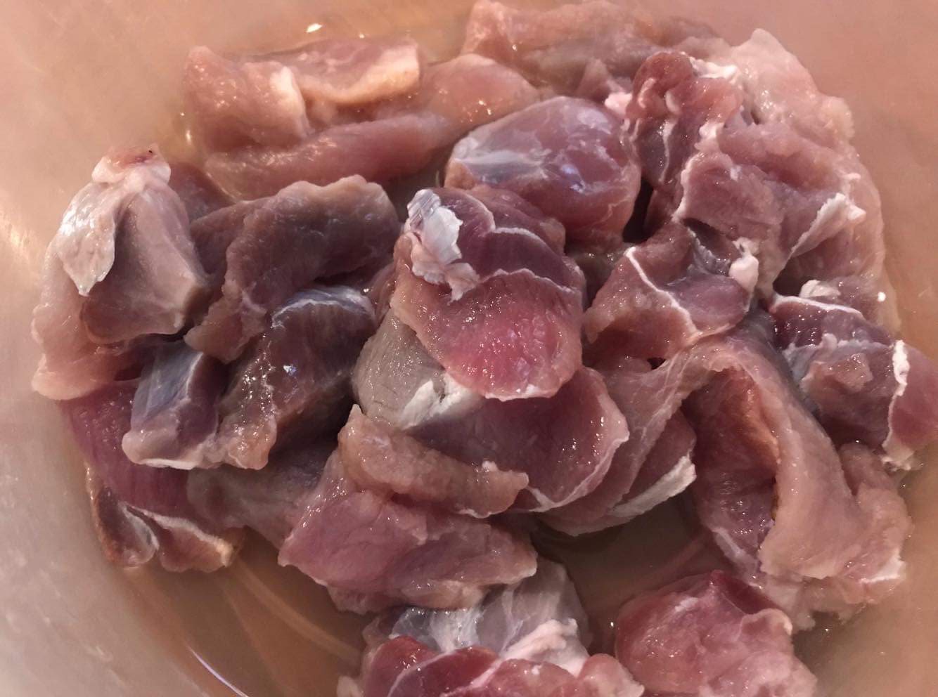เริ่มจากหั่นหมูป่าเป็นชิ้นพอคำแล้วหมักกับผงฟูค่ะ ให้เนื้อนุ่มที่สุดเท่าที่จะทำได้