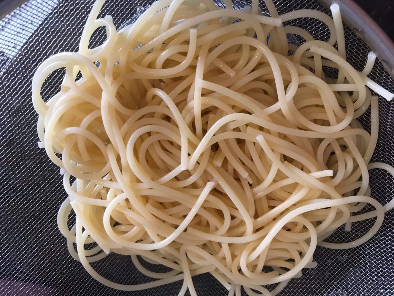 ตั้งน้ำให้เดือด ต้มเส้นสปาเก็ตตี้ 8 นาทีพอ เราชอบแบบอัลเด็นเต้ค่ะ ใครชอบเส้นนิ่มๆก็ต้ม10 นาทีตามที่ข้างถุงบอกไว้ก็ได้ค่ะ