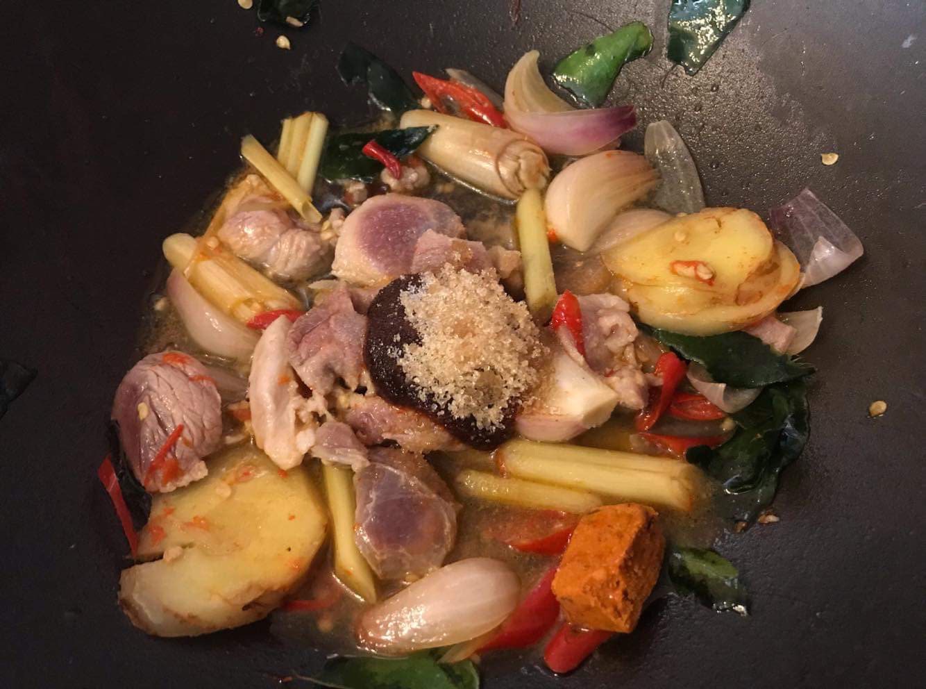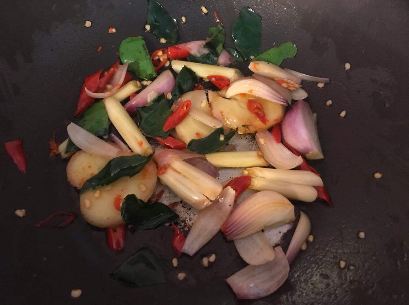 ตั้งกระทะใส่น้ำมันสักช้อนโต๊ะ ใส่สมุนไพรต่างๆลงไปก่อนผัดให้หอมๆ จากนั้นใส่หมูป่าลงไป