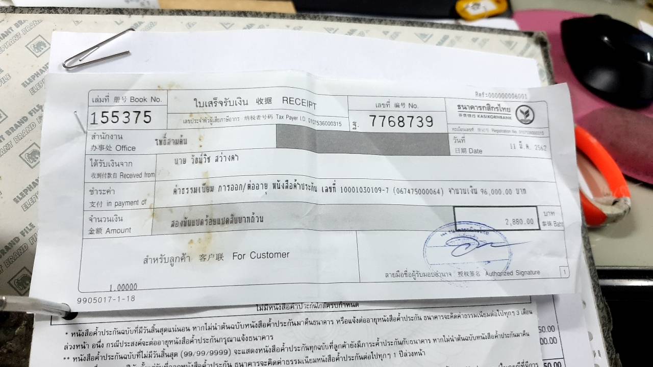 เมื่อปลายๆเดือน พ.ย. 2562 ผมได้รับหนังสือแจ้งเตือนให้ไปชำระค่าธรรมเนียม หนังสือค้ำประกัน แต่เคยไปติดต่อจะชำระที่สาขาอื่นแล้ว แต่ธนาคารแจ้งว่าต้องไปชำระที่สาขาที่ทำหนังสือไว้เท่านั้น ก็เลยทำให้มีการล่าช้าเพราะยังหาโอกาสไปไม่ได้ จนเมื่อวันที่ 4 ธันวาคม 2562 มีโทรศัพท์โทรเข้ามาทวงอีก ผมเลยลางานไปที่สาขาโพธิ๋สามต้น ซึ่งเป็นสาขาที่ทำหนังสือค้ำประกัน แต่พอดีหาหนังสือทวงเงินไม่เจอ จึงหยิบใบชำระงวดที่แล้วไป ( ชำระไว้เมื่อ 11 มี.ค.62 ) ตามรูป