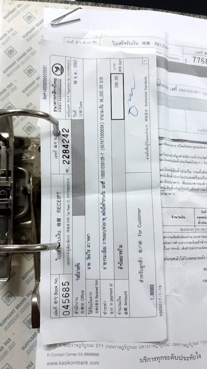 และมีน้องเจ้าหน้าที่ผู้ชายมาให้บริการ ( ไม่ทราบชื่อ) โดยน้องแจ้งว่า มียอดชำระ 500 บาท เป้นค่าธรรมเนียมชำระล่าช้า ซึ่ง ผมไม่ค่อยเข้าใจที่น้องอธิบายเลยขอพบผู้การ ซึ่งต่อมาน้องกับผู้การก็พยายามอธิบายว่า ยอดที่ผมจ่ายเมื่อวันที่ 11 มี.ค62 เป็นยอด สำหรับปี 57-59 และยอด 500 ที่จะเก็บเพิ่ม เป็นค่าธรรมเนียมหนังสือค้ำประกันที่ผมจ่ายล่าช้า ตามใบเก่าที่ผมเสียไปแล้วบอกว่าหมด เดือนกันยายน 2562 ตามรูปที่แนบไปด้านบน ผมก็ถามว่าทำไมยอดถึงเป็น 500 น้องและผู้การแจ้งว่า ปกติค่าธรรมเนียมแค่ สองร้อยกว่าบาท แต่ธนาคารมีกฏว่าเก็บขั้นต่ำ 500 จึงต้องเก็บ500 ผมพยายามอธิบายและสอบถามอยู่ชั่วโมงกว่า ในที่สุดก็เลยบอกไปว่า เอาล่ะ ไม่เป็นไร ผมจะยอมจ่ายไปก่อน แบบไม่ค่อยเข้าใจ โดยพนักงานแจ้งว่าหากหนังสือค้ำประกันออกจะโทรมาตามให้ผมไปจ่ายอีก 2800 เป็นค่าหนังสือค้ำประกัน สำหรับปี 63-65