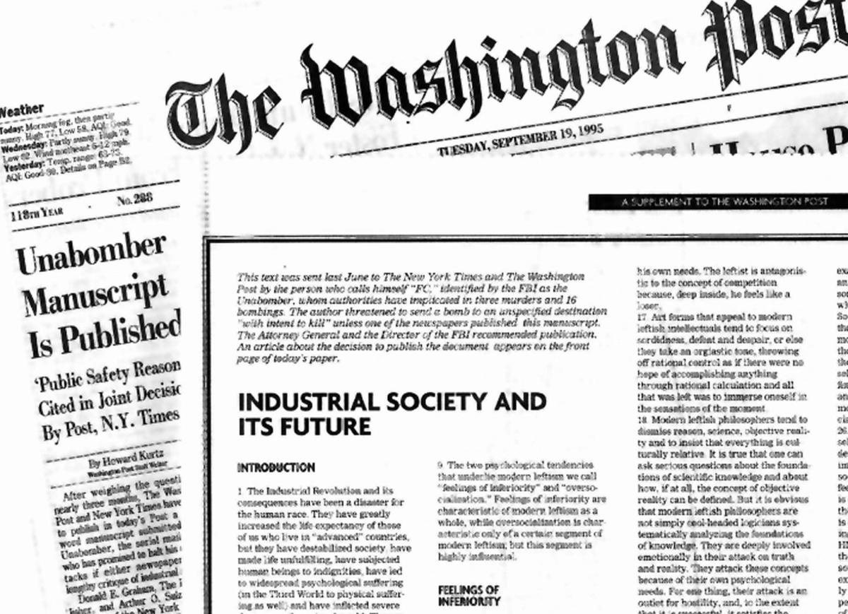 ปี 1996 เท็ด คาซินสกี เรียกร้องให้ Newyork Times และ Washington Post ตีพิมพ์บทความของเค้าในหัวข้อ "สังคมอุตสหกรรมและอนาคต" โดยยื่นข้อเสนอว่าจะหยุดวางระเบิด