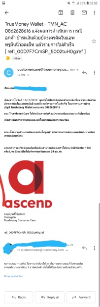 เมื่อติดต่อกับทาง CC ของ TrueWallet ได้เรียบร้อย ผมก็ส่งหลักฐานไปตามอีเมลที่ CC แจ้ง หลังจากนั้นได้อีเมลตอบกลับมาตามภาพ