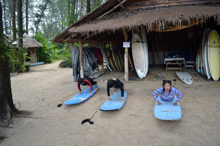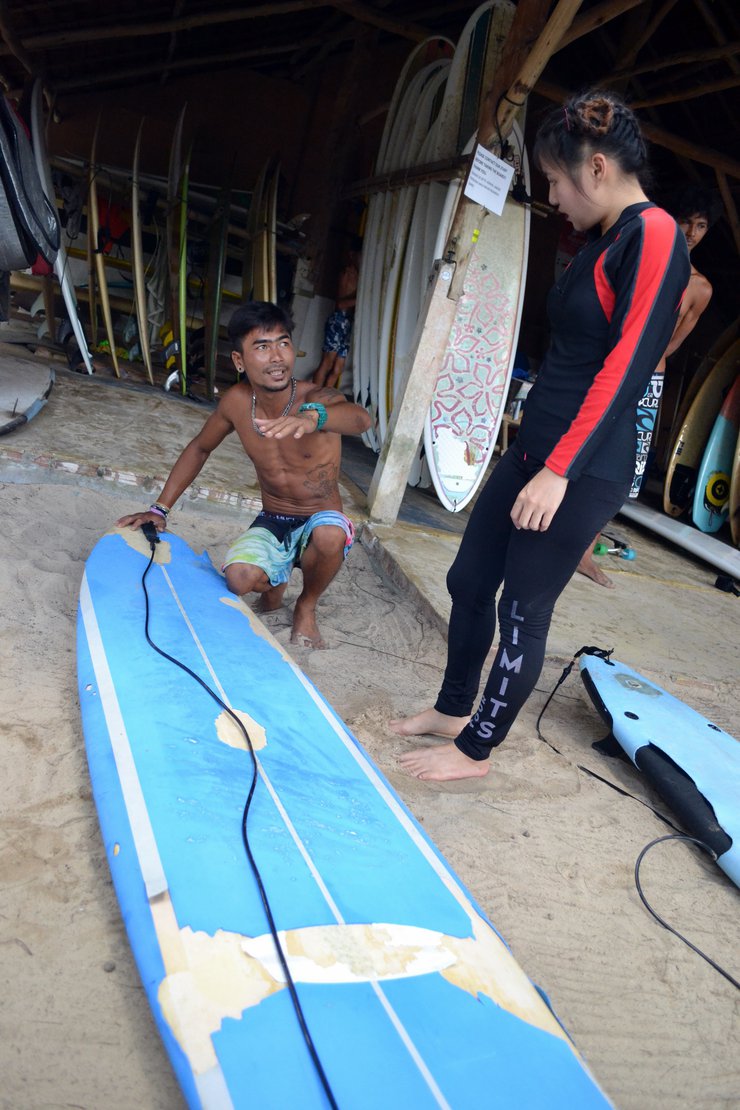 ปะ ! เราไปดูที่เรียนเซิร์ฟกัน ที่นี่ราคาเรียนไม่แพงนะคะ พี่เค้าจะสอนเราบนบกก่อน ถ้ามีอะไรสงสัยสอบถามได้เลย แล้วเราก็จะได้ลงน้ำโดยมีโค้ชข้างกายเป็นเวลากว่า 1 ชั่วโมง ส่วนเวลาทั้งวันที่เหลือทั้งวันปล่อยคะ ปล่อยเราเล่นเองตามสบายยยยย จะเล่นได้ไม่ได้ก็ตามแล้วแต่ทักษะของแต่ละคนเนอะ