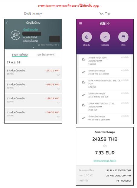 3. แม้ว่าบัตร Debit Journey จะเป็นบัตร Visa Paywave แต่สิ่งที่เจอคือ ร้านค้าที่ใช้ในเวียนนา และอัมสเตอร์ดัม (เพราะใช้รูดสกุลเงินยูโรบัตร Debit Journey ถูกกว่าบัตร You Trip) เครื่องรูดจะบังคับให้ลูกค้าที่ใช้บัตร เมื่อแตะบัตรแล้วจะต้องใส่รหัสยืนยันตัวบุคคล 4 หลัก แต่บัตร Debit Journey เป็นบัตรชนิด Pin 6 หลัก จึงไม่สามารถรูดหรือทำรายการกับร้านค้าได้ แต่รายการตามภาพประกอบเป็นการทำรายการแบบออนไลน์ สรุปคือ ถือบัตรไปไม่สามารถใช้ได้ในประเทศออสเตรียและเนเธอแลนด์ ติดปัญหาเรื่องการใส่ Pin