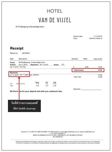 2. จากข้อ 1 พอดีมีปัญหาการเช็คอินวันที่ 27 พฤศจิกายน 2562 กับโรงแรมที่อัมสเตอร์ดัม ซึ่งจองมา 2 Bookings โดยทางโรงแรมให้จ่าย City Taxes เพิ่ม Booking แรกจ่าย Taxes เพิ่ม 4.04 Euro (138.23 บาท) Booking ที่สองจ่าย Taxes เพิ่ม 13.98 Euro (478.33 บาท) ผมจึงใช้บัตร Debit Journey รูดไป แต่เมื่อมาเช็คยอดที่รูดเป็นเงินยูโรแปลงเป็นค่าเงินบาท จะเห็นว่าใน Statements ไม่แสดงสกุลเงิน Euro และชื่อโรงแรมที่ทำรายการ อีกทั้งเมื่อแปลงค่าเป็นสกุลเงินบาทแล้วพบว่า อัตราแลกเปลี่ยนเท่ากับ 34.2153 (ซึ่งไม่ใช่อัตราแลกเปลี่ยนของบัตร Debit Journey ณ วันนั้น) ข้อนี้ผมต้องการคำตอบจากกสิกร เพราะว่าวันที่ 27 พฤศจิกายน 2562 อัตราแลกเปลี่ยนของบัตร Debit Journey จนถึง ณ วันที่ 12 ธันวาคม 2562 อัตราแลกเปลี่ยนอยู่ระหว่าง 33.40-33.66 แต่ทำไมรายการวันที่ 27 พฤศจิกายน 2562 ที่ผมทำรายการ อัตราแลกเปลี่ยนจึงเป็น 34.2153