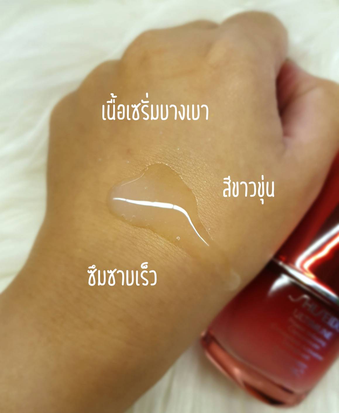 หลังจากที่เราได้ทำความรู้จักกับเจ้าเซรั่มตัวนี้ไปแล้ว เรารู้สึกว่าอยากทดลอง เนื่องจากเราชอบใช้พรีเซรั่มอยู่แล้ว และยิ่งเป็นแบรนด์ SHISEIDO ที่โด่งดัง ยิ่งทำให้อยากใช้มากขึ้นไปอีก เรามาดูรูปประกอบกันบ้างนะคะ จะสังเกตเห็นว่าเนื้อเซรั่มเป็นสีขาวขุ่น เนื้อค่อนข้างบางเบา ซึมซาบเร็ว ไม่เหนียวเหนอะหนะเลย สามารถใช้ได้ทั้งเช้าและเย็นก่อนลงสกินแคร์ที่ใช้เป็นประจำทุกวันเลยนะคะ