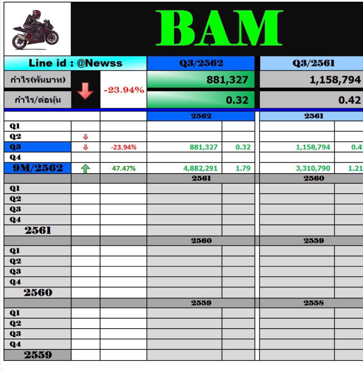 ............................BAM พร้อมเทรด 16 ธ.ค.62 อวดกำไร 9 เดือนพุ่ง 47.5 %                                                                                                            การเข้าจดทะเบียนในตลาดหลักทรัพย์แห่งประเทศไทย เป็นโอกาสสำหรับประชาชนและนักลงทุนที่สนใจสามารถเป็นเจ้าของบริษัทบริหารสินทรัพย์ที่ใหญ่ที่สุดของประเทศ และมีเครือข่ายสาขาและสำนักงานมากที่สุดครอบคลุมทั่วทุกภูมิภาค พร้อมศักยภาพในการสร้างโอกาสในทุกภาวะเศรษฐกิจและการเติบโตจาก NPLs และ NPAs ในระบบธนาคารที่เติบโตอย่างต่อเนื่องสำหรับผลการดําเนินงานงวด 9 เดือน ปี 2562 BAM มีรายได้รวม 9,206 ล้านบาท เพิ่มขึ้น 43.4% จากงวดเดียวกันของปี 2561 และมีกำไรสุทธิ 4,882 ล้านบาท เพิ่มขึ้น 47.5 % จากงวดเดียวกันของปี 2561  https://www.hooninside.com/news-feed/138996/view/