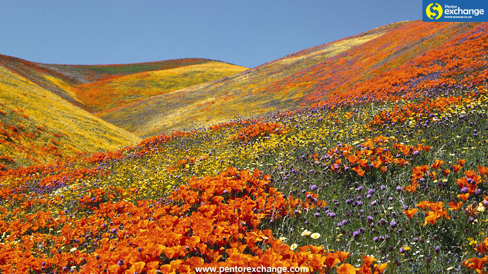 ในภาพคือ California Poppy ดอกป๊อปปี้สีเหลืองทองอร่ามเติบโตและผลิดอกบานสะพรั่งสวยงามไปทั่วหุบเขา Antelope Valley ในระหว่างช่วงฤดูใบไม้ผลิ ซึ่งดอกป๊อปปี้นับล้านจะตั้งดอกอย่างสง่างามไล่สลับสีเหลืองอ่อนเข้มไปมา ท่ามกลางอากาศที่บริสุทธิ์ของทะเลทราย The Mojave Desert