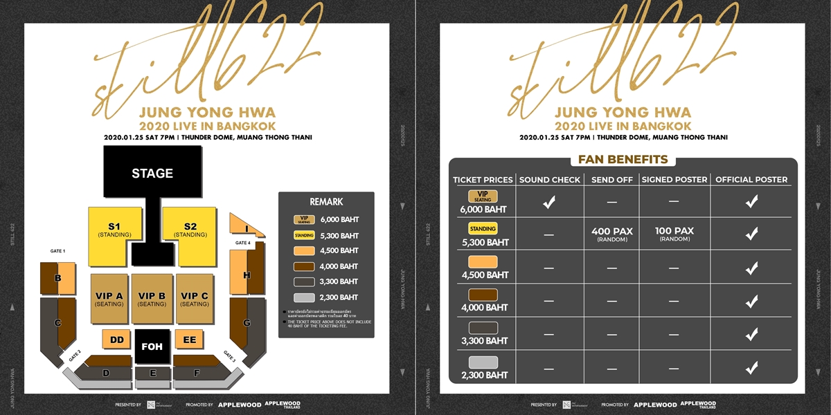 ใครที่คิดถึงหนุ่มยงฮวาจำกำหนดการสำคัญไว้ให้แม่นๆ เพราะผู้จัดอย่าง บริษัท แอ๊ปเปิ้ลวูด เกาหลี (APPLEWOOD CREATIVE) และ บริษัท แอ๊ปเปิ้ลวูด ไทยแลนด์ (APPLEWOOD THAILAND) เริ่มจำหน่ายบัตรคอนเสิร์ต 2020 JUNG YONG HWA [STILL 622] LIVE in Bangkok วันเสาร์ที่ 10 ธันวาคม 2562 เวลา 10.00 น.เป็นต้นไป บัตรราคา 6,000 บาท [VIP Standing] / 5,300 บาท [VIP Standing] / 4,500 บาท / 4,000 บาท / 3,300 บาท และ 2,300 บาท ทาง www.allticket.com แล้วเจอกัน!