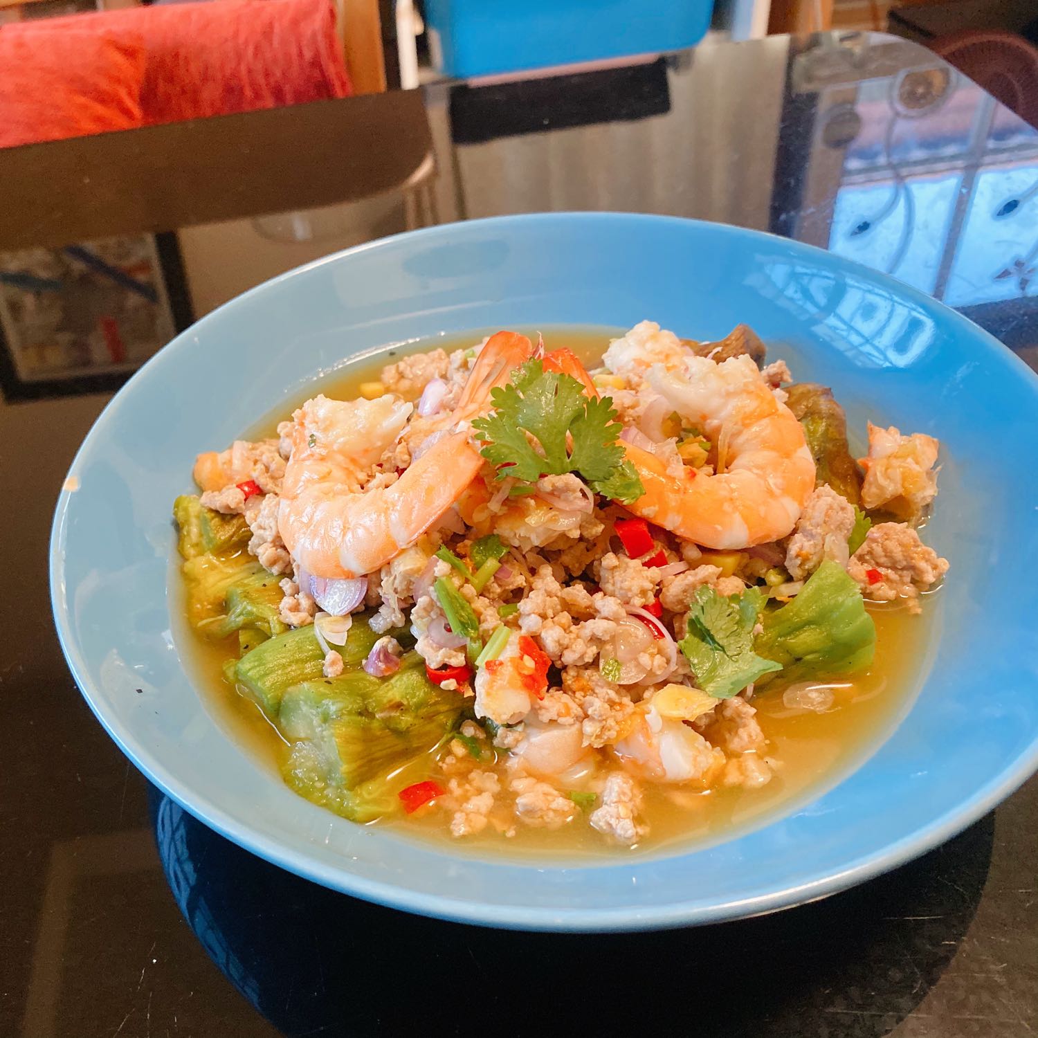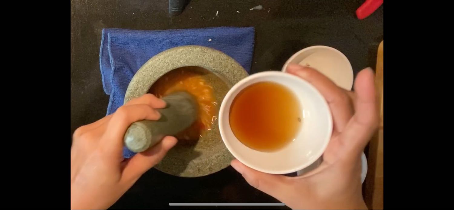 เทน้ำยำที่ปรุงเสร็จแล้ว ลงไปในหมูสับกับกุ้งสับเลยจ้า