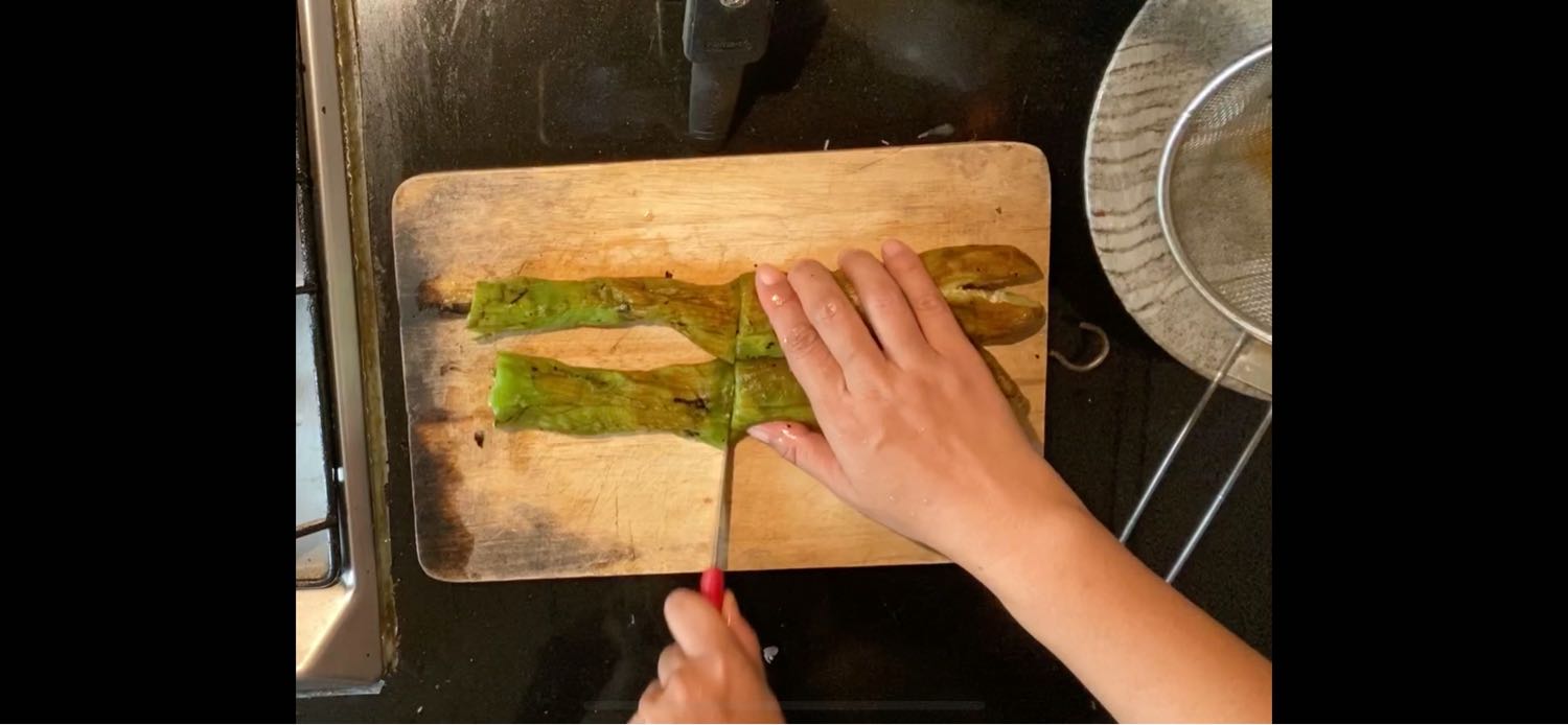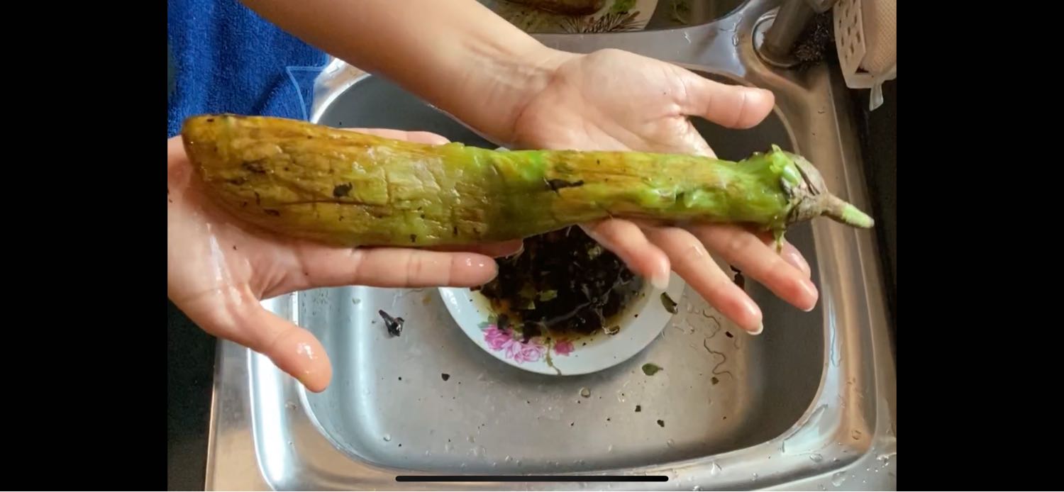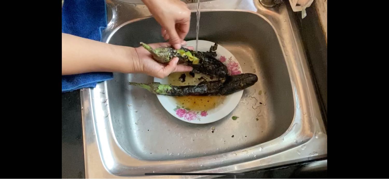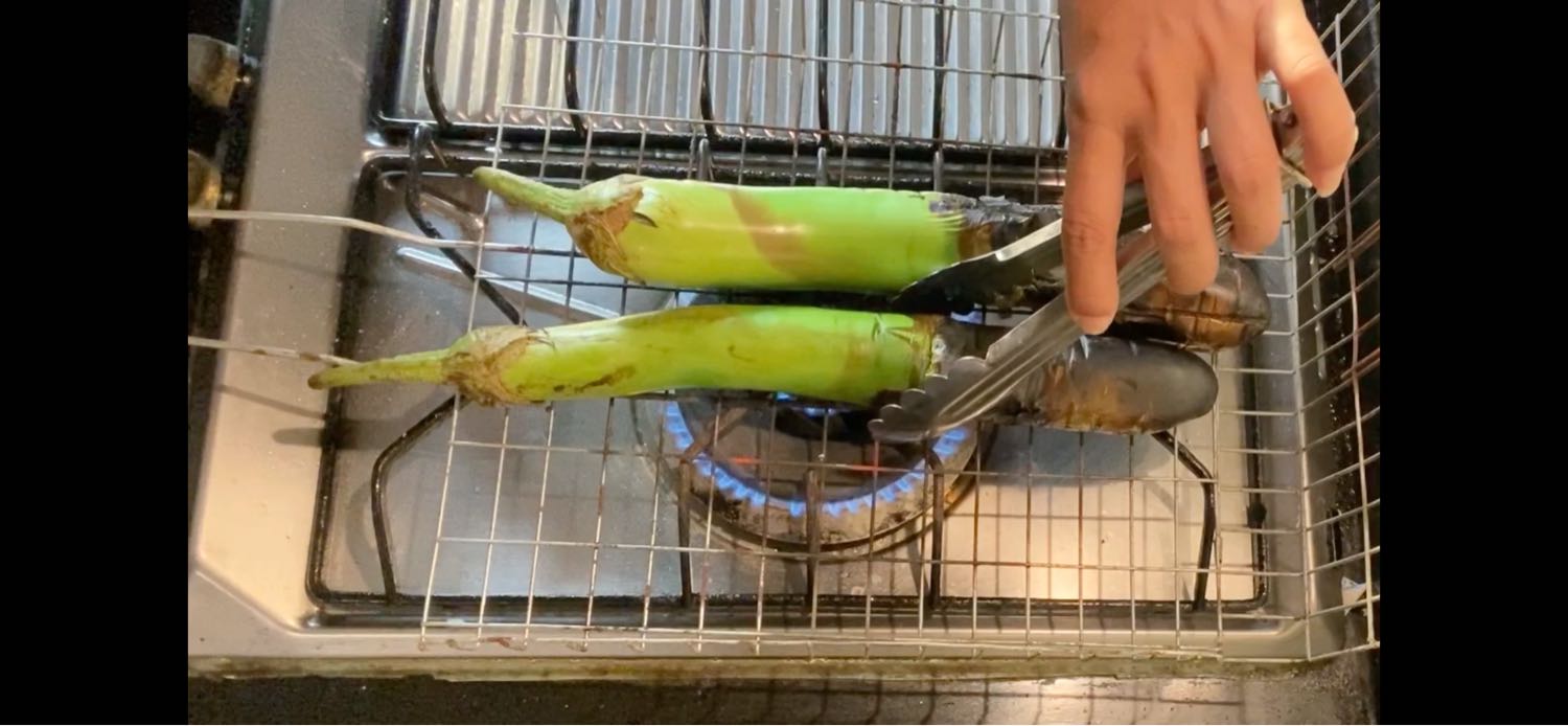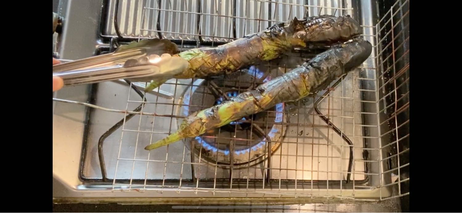 นำมะเขือยาวมาเผากับเตาแก๊ส เผาจนมะเขือยาวเป็นสีดำทั้งลูก
