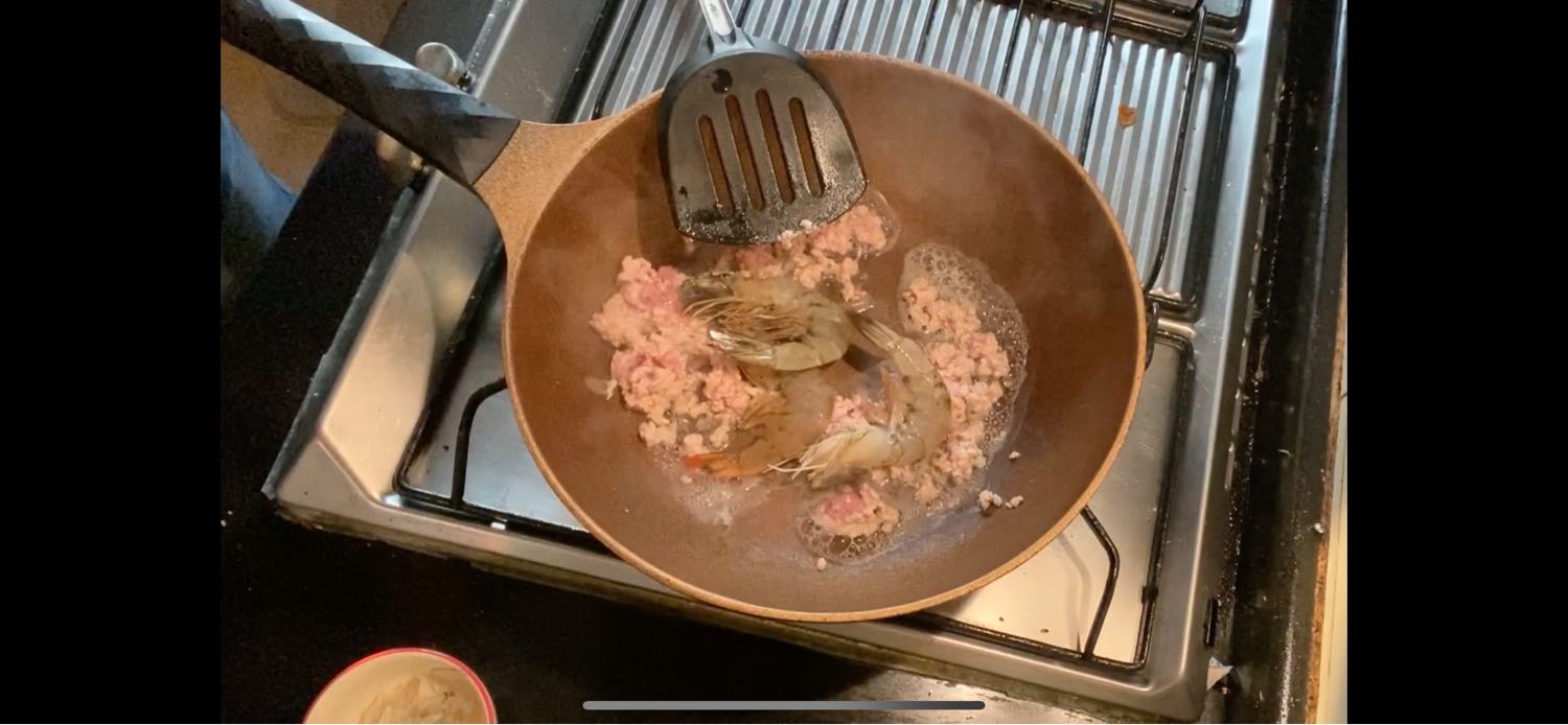 นำหมูสับกับกุ้งมาผัดกับกระทะให้สุก