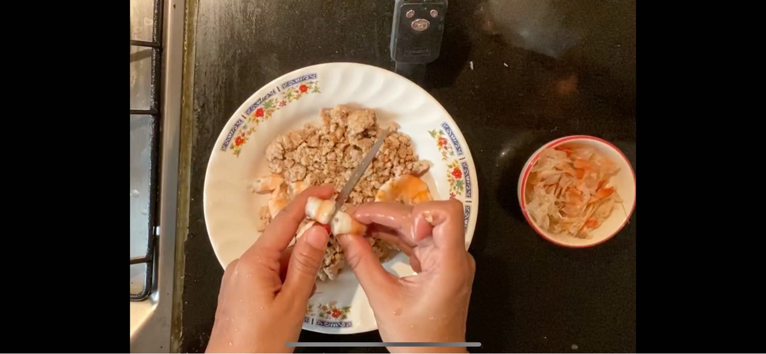พอสุกแล้วแกะเปลือกกุ้งออกและหั่นให้เป็นชิ้นเล็กๆ