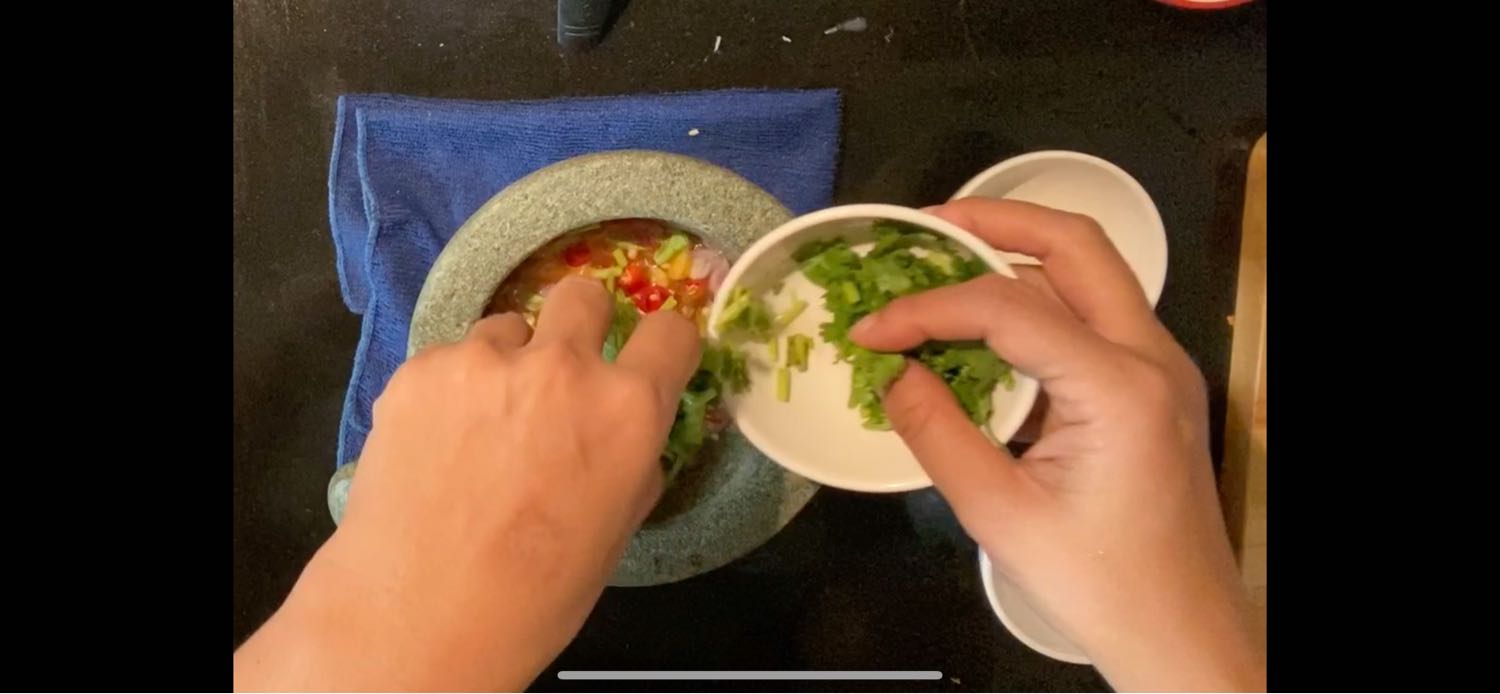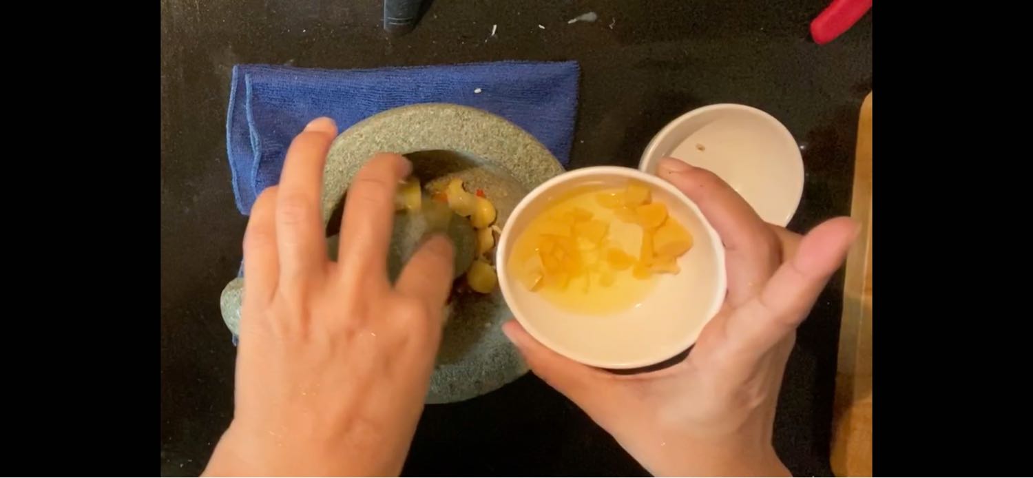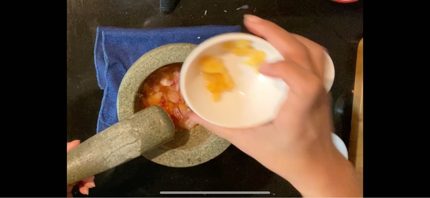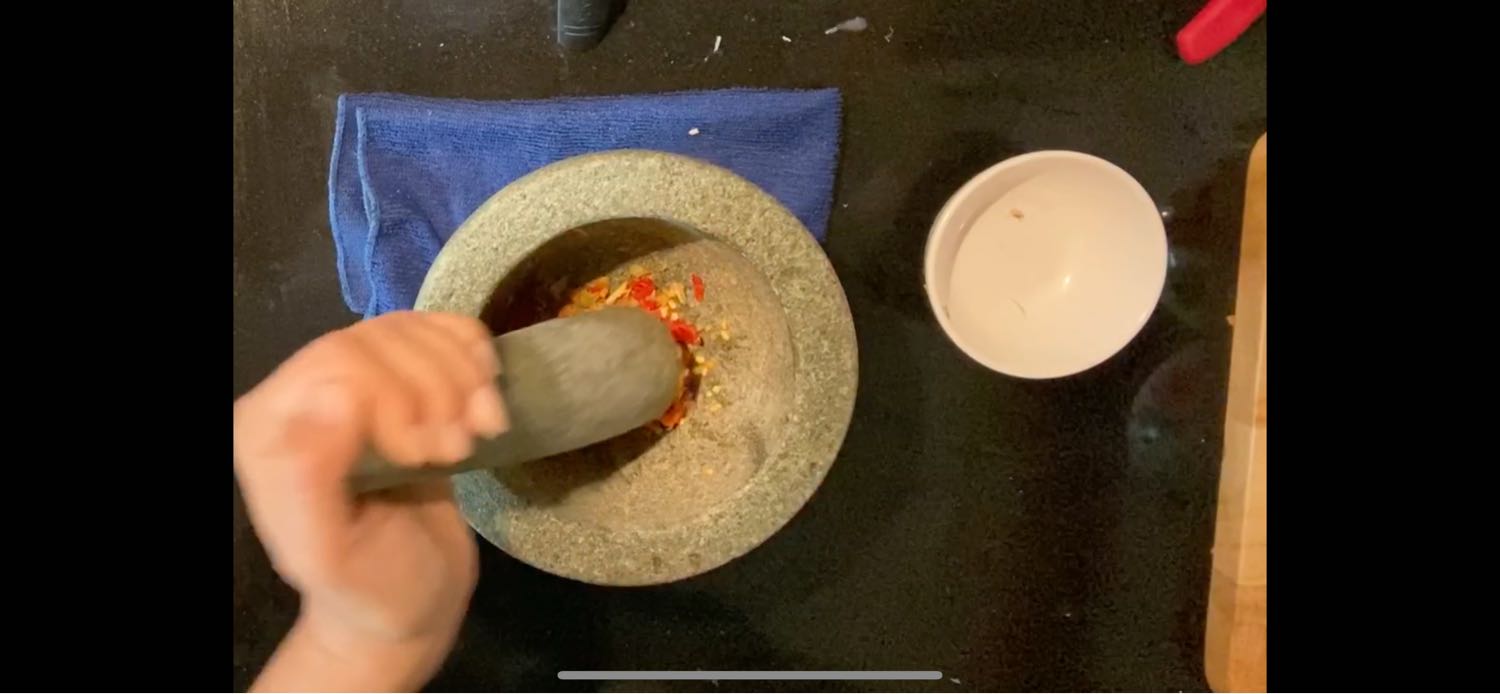 โขลกรากผักชี +กระเทียม+พริกเข้าดเวยกัน