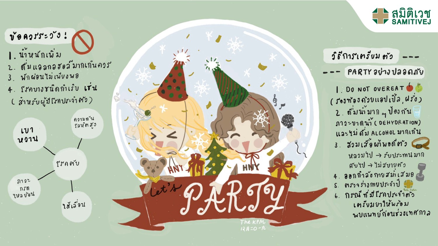 สนุก ร่าเริงกันได้อย่างเต็มที่ แม้แต่คนที่มีโรคประจำตัว ถ้ามีการเตรียมตัวที่ดีทั้งก่อนและระหว่างปาร์ตี้ แต่ถึงจะเตรียมตัวดีแค่ไหน ก็ต้องสนุกกันอย่างมีสติด้วยนะครับ