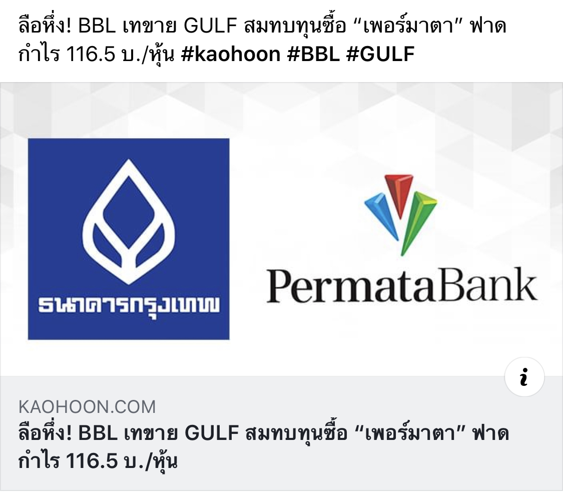 ข่าวลือว่า แบงค์กรุงเทพ เทหุ้น GULF มาซื้อ Permata หรอครับ ใครเช็ค % การถือครองหุ้นได้บ้าง