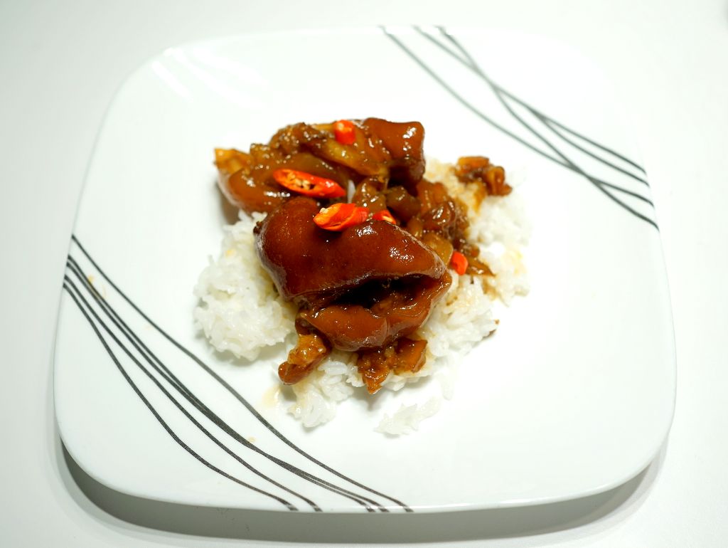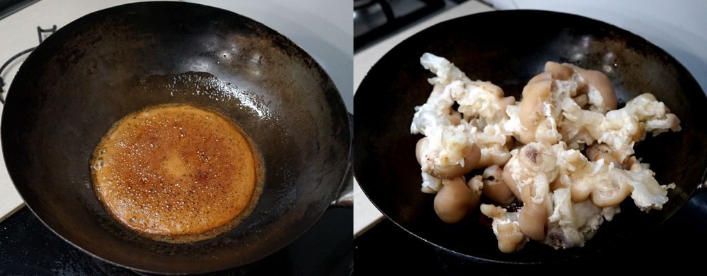 เอาหอมแขกหรือหอมใหญ่ 1 หัวซอยหยาบๆ ลงในหม้อกระทะความดัน ใส่เอ็นหมูคลุกซอสลงไป