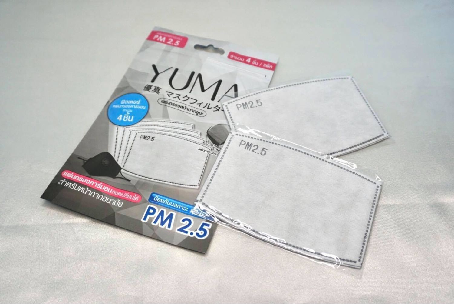 และเนื่องจากฝุ่นPM 2.5 มีขนาดเล็กมากการป้องกันแค่หน้ากากอาจจะไม่พอ ยูมะจึงมีแผ่นกรองคาร์บอน ใช้กับหน้ากากอนามัยยูมะโดยเฉพาะ สามารถสอดเข้าหน้ากากด้านในได้ เป็น Activated Carbon Filter แผ่นกรองคาร์บอนทั้งหมด 5 ชั้น! ได้แก่
