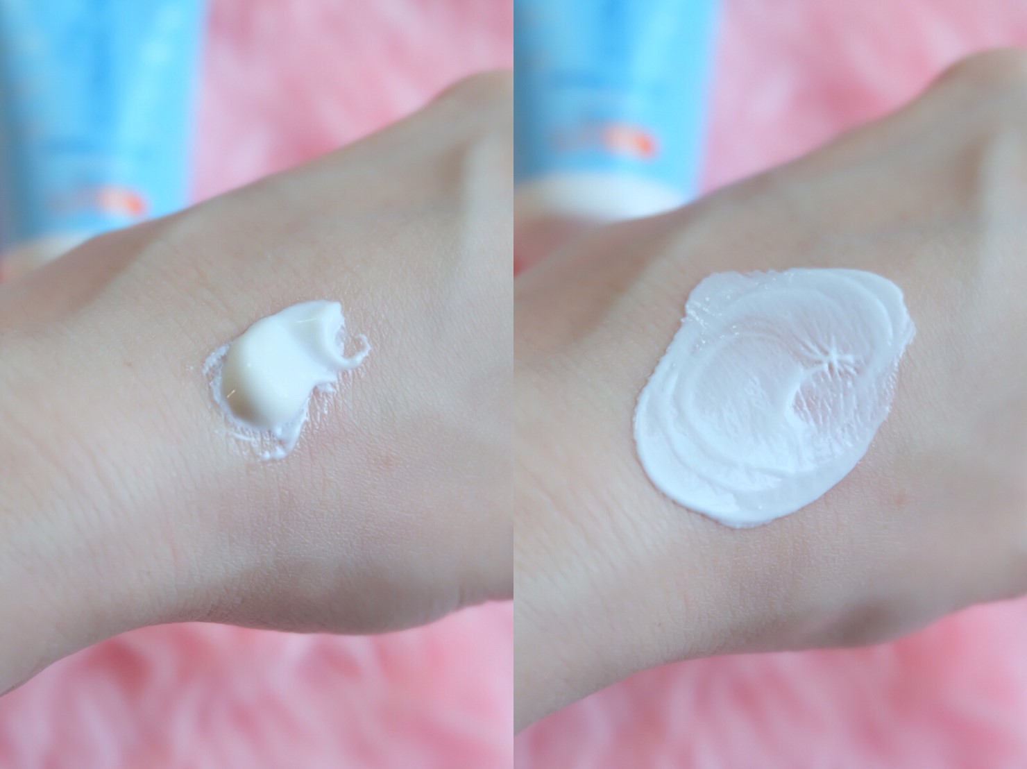 "เนื้อครีมสีขาว เกลี่ยง่าย บางเบา ซึมซาบเร็ว ไม่เหนียวเหนอะหนะ"