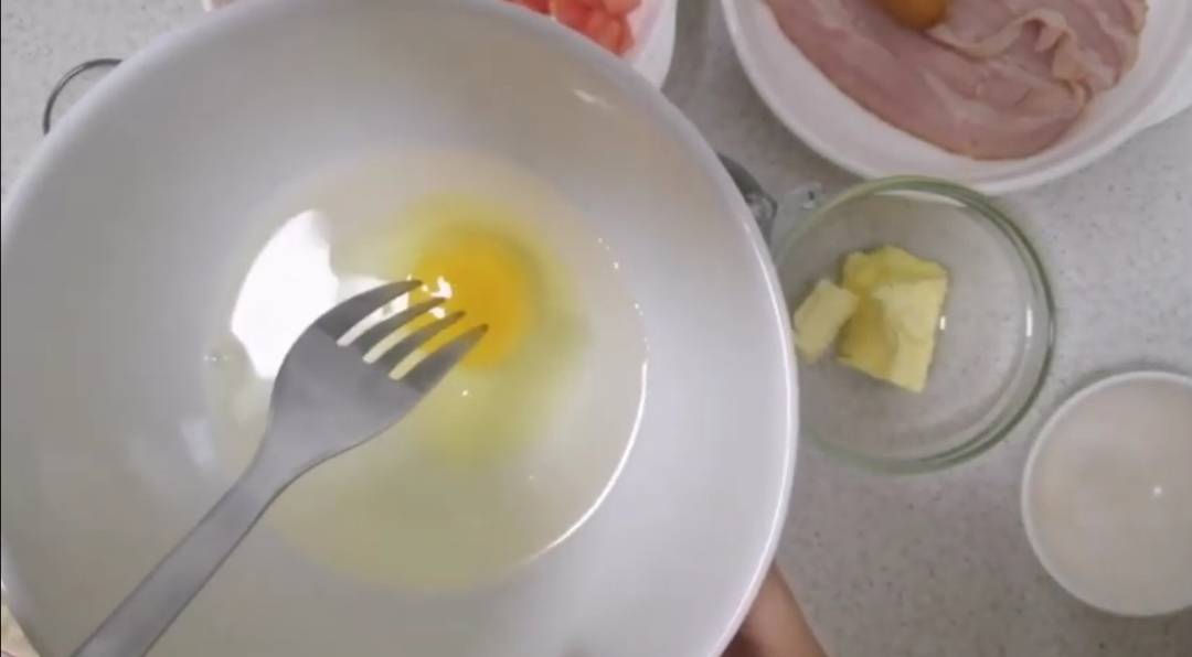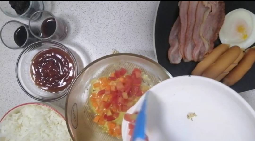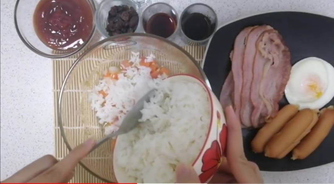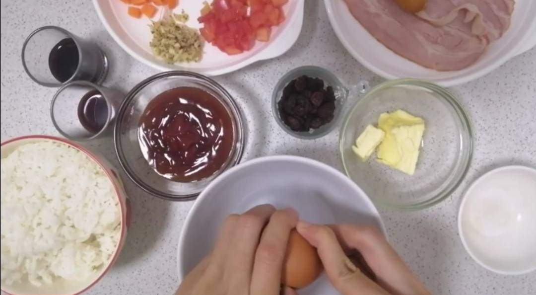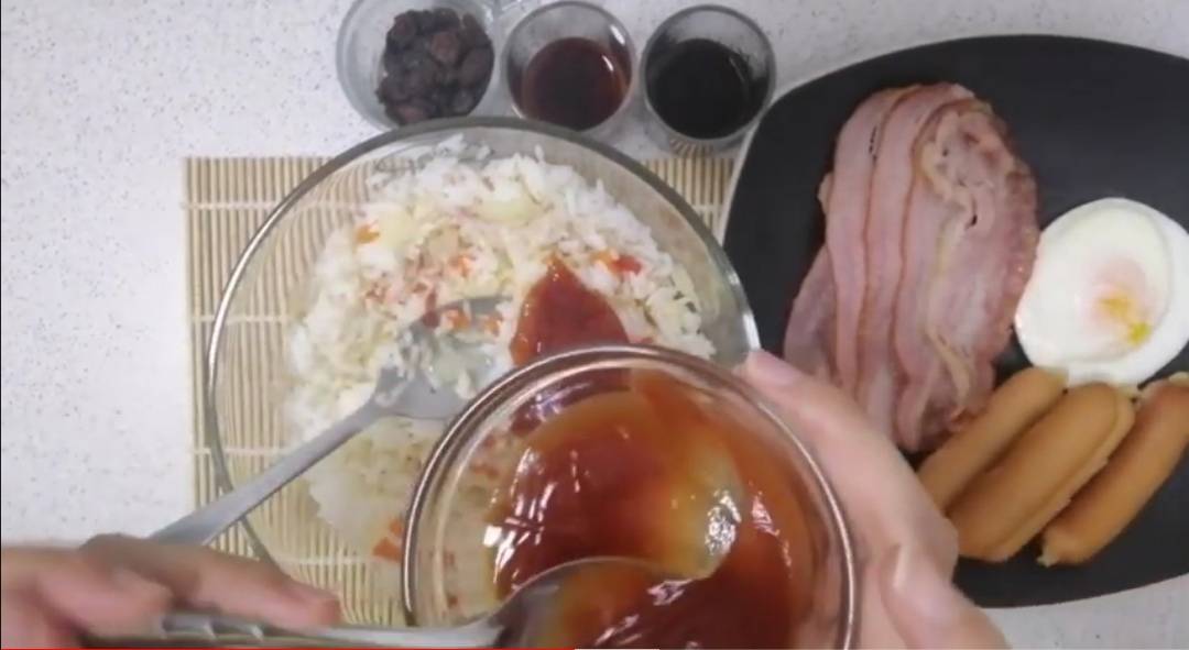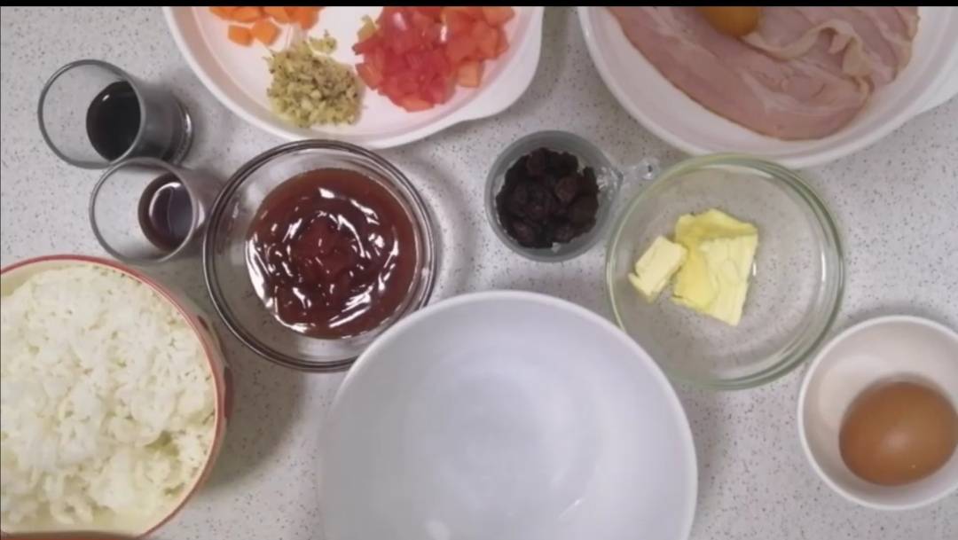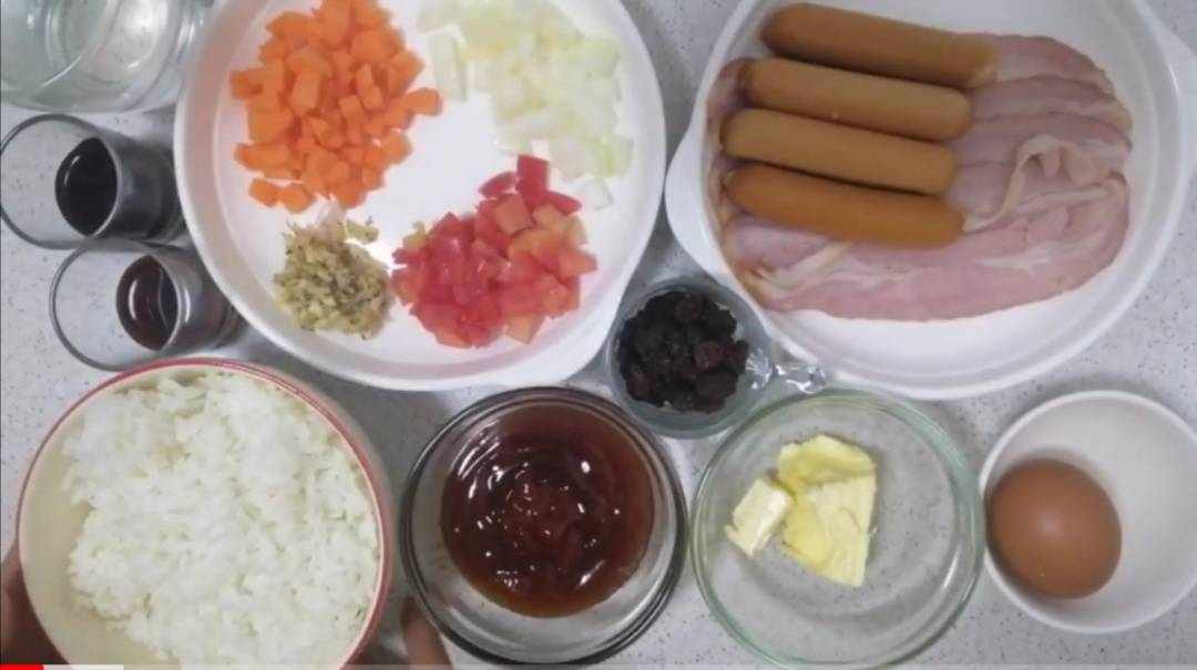 1.ข้าวสวย 2.ไข่ไก่ 3.เบคอน 4.ไส้กรอก 5.เนย 6.ซอสมะเขือเทศ 7.ซอสปรุงรส 8.น้ำมันหอย 9.ลูกเกด 10. น้ำเปล่า 11.แครอท 12.หอมหัวใหญ่ 13.มะเขือเทศ (เอาเม็ดออก) 14.กระเทียม 15.พริกไทย