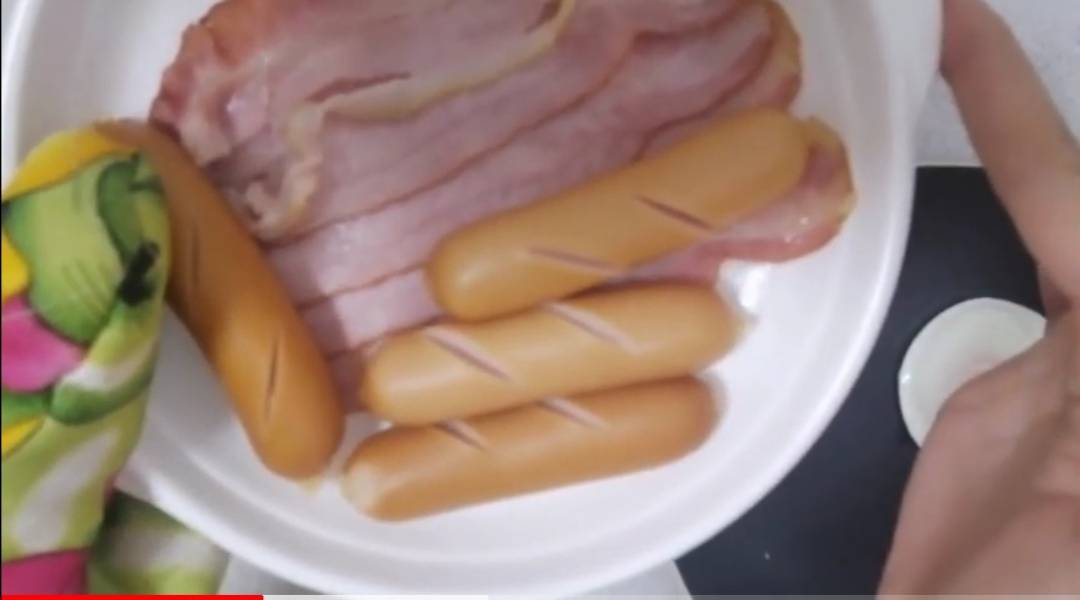 นำเบคอน และ ไส้กรอกเข้าไมโครเวฟ แล้วพักทิ้งไว้