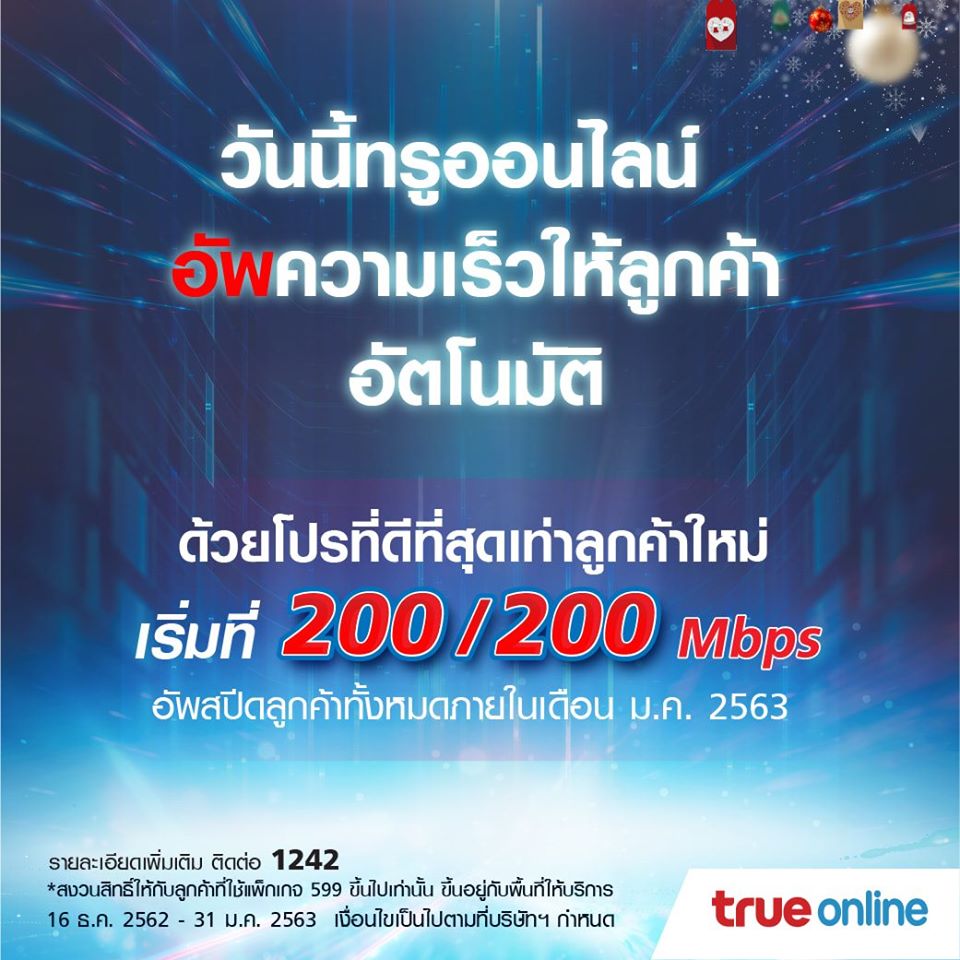 ที่ได้มีการโปรโมทข้อความ “วันนี้ทรูออนไลน์ อัพ ความเร็วให้ลูกค้าอัตโนมัติ ด้วยโปรที่ดีที่สุดเท่าลูกค้าใหม่ เริ่มที่ 200/200 Mbps อัพสปีดลูกค้าทั้งหมดภายในเดือน ม.ค.2563” **สงวนสิทธิ์ให้กับลูกค้าที่ใช้แพ็กเกจ 599 ขึ้นไปเท่านั้น 16 ธ.ค62-31ม.ค.62 หรือไม่ครับทำให้ได้ความเร็วของ 699บาท/เดือน และ 599บาท/เดือน ได้ความเร็วที่เท่ากัน