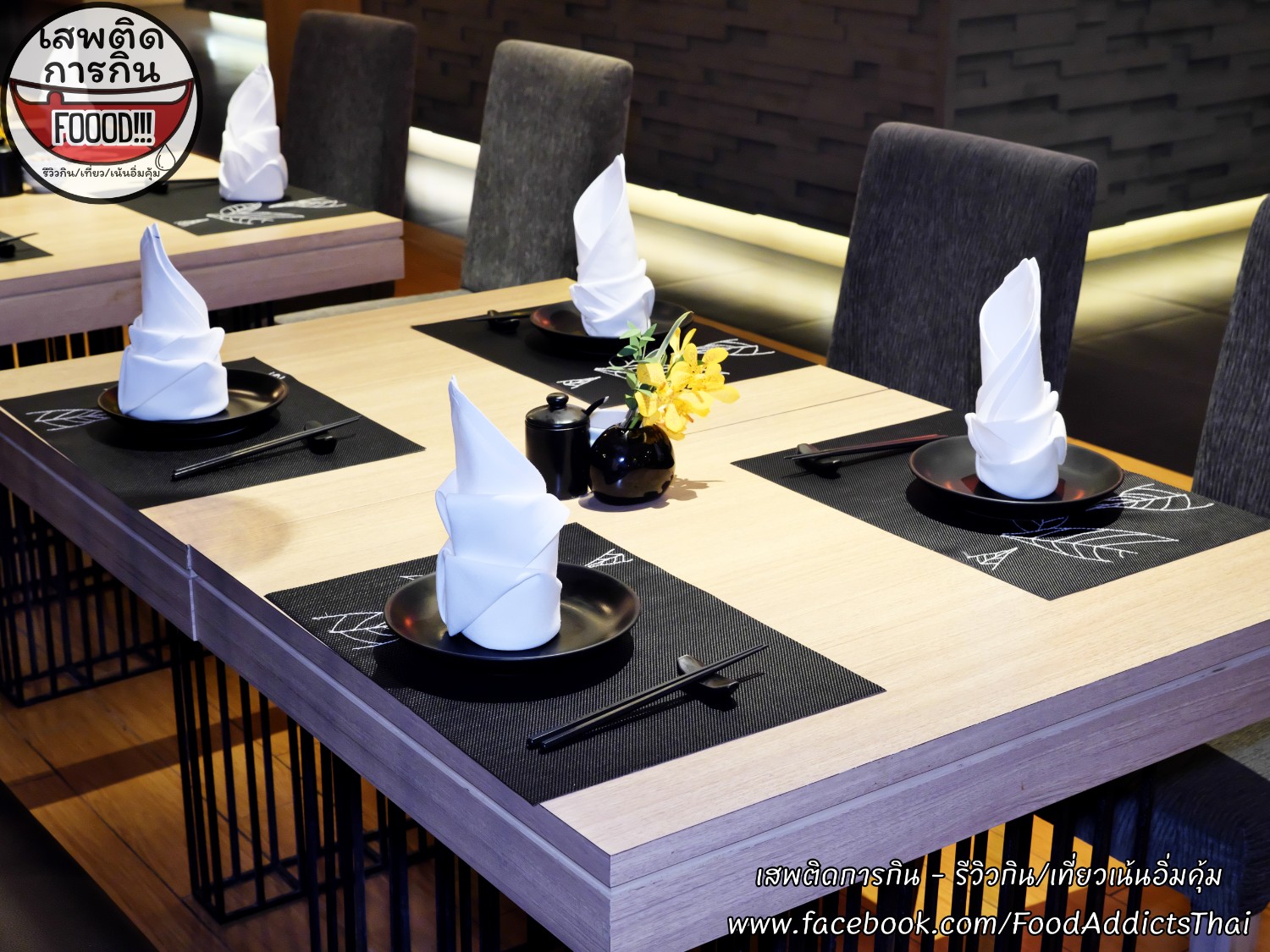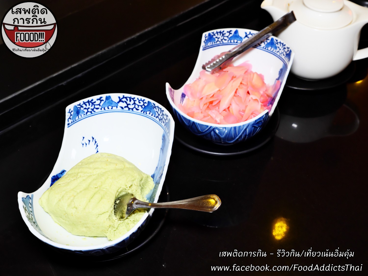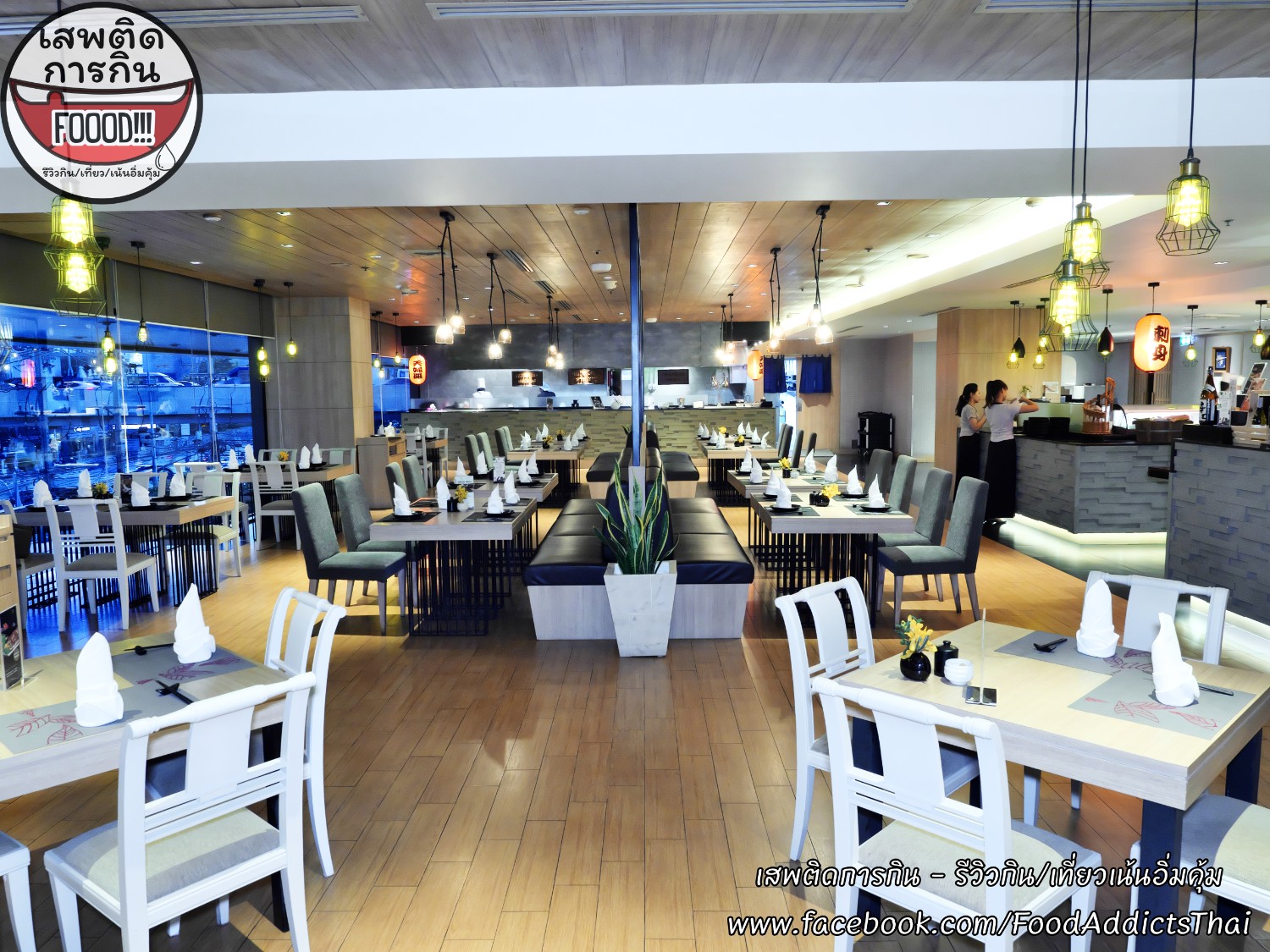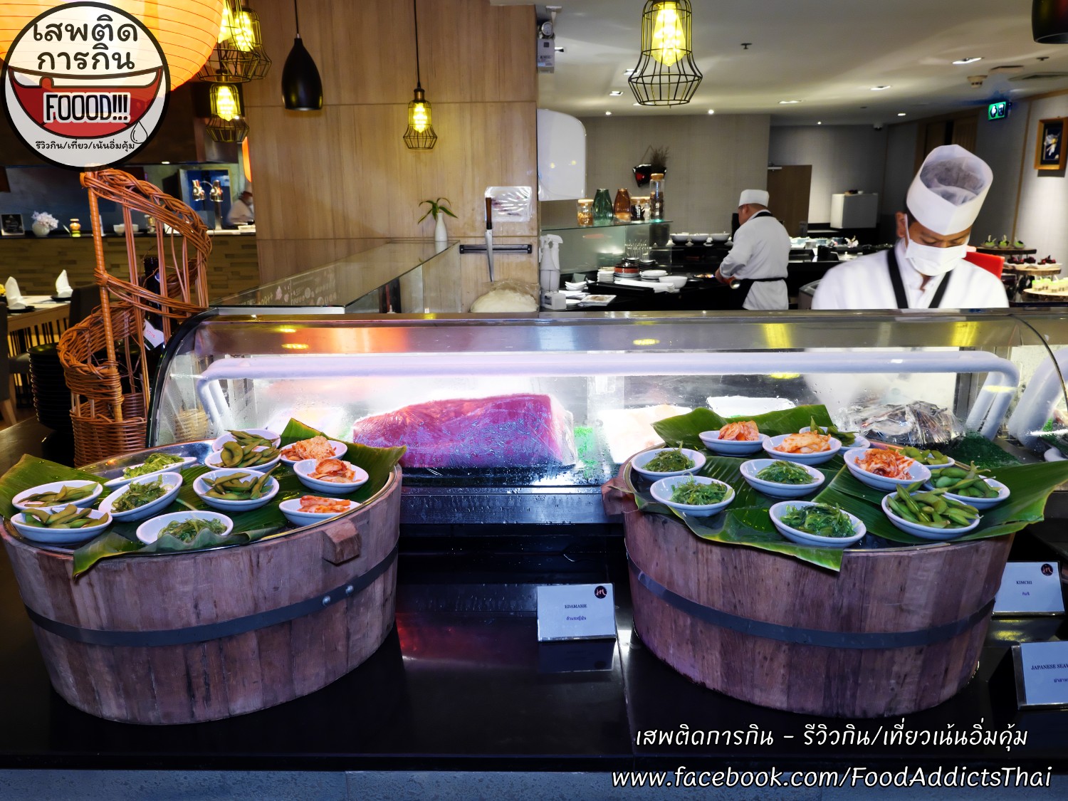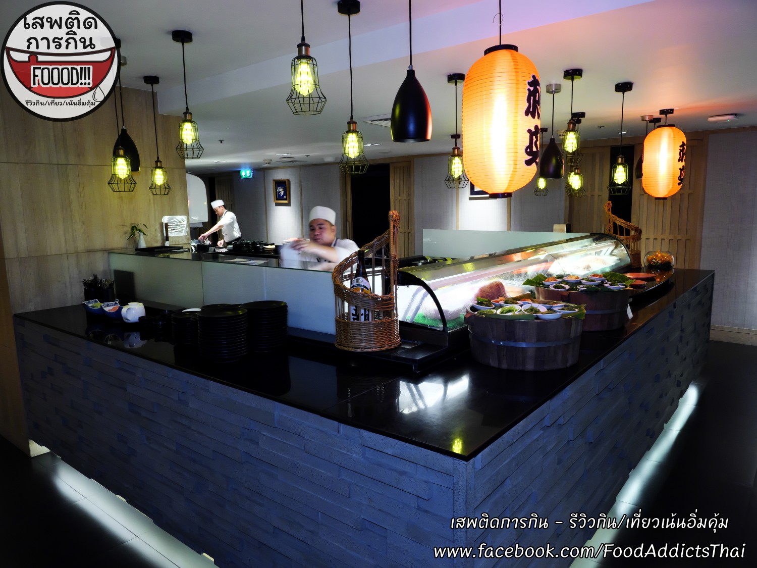 ห้องอาหารที่นี่ค่อนข้างใหญ่ตกแต่งด้วยสไตล์โมเดิร์นและไฟสีส้มทั้งห้องทำให้รู้สึกอบอุ่น และนั่งทานได้ยาวไม่รู้สึกอึดอัด โซนแรกเป็นส่วนที่เชฟทำการเตรียมเมนูซูชิและซาชิมิต่างๆเตรียมไปเสิร์ฟให้เราที่โต๊ะ ใครอยากดูหน้าตาของวัตถุดิบต่างๆก็มาส่องที่ตู้แช่เย็นกันได้ ด้านล่างวางเครื่องเคียงไว้ให้หยิบ 3 เมนูคือ กิมจิ/ยำสาหร่ายญี่ปุ่นและเอดามาเมะหรือถั่วแระญี่ปุ่น โชยุ/วาซาบิ/ขิงดองก็ถูกวางเอาไว้เช่นเดียวกัน เราจะมาหยิบเองหรือสั่งให้พนักงานไปเสิร์ฟที่โต๊ะให้ ทางห้องอาหารเขาก็ยินดีนะครับ เพราะ Concept ของที่ห้องอาหารนี้คือเสิร์ฟให้ทานที่โต๊ะ ของต่างๆในไลน์อาหารนี้วางไว้เพื่อให้พนักงานเตรียมเสิร์ฟได้อย่างสะดวกเฉยๆ แต่เราสามารถเดินมาดูก่อนได้เช่นเดียวกัน