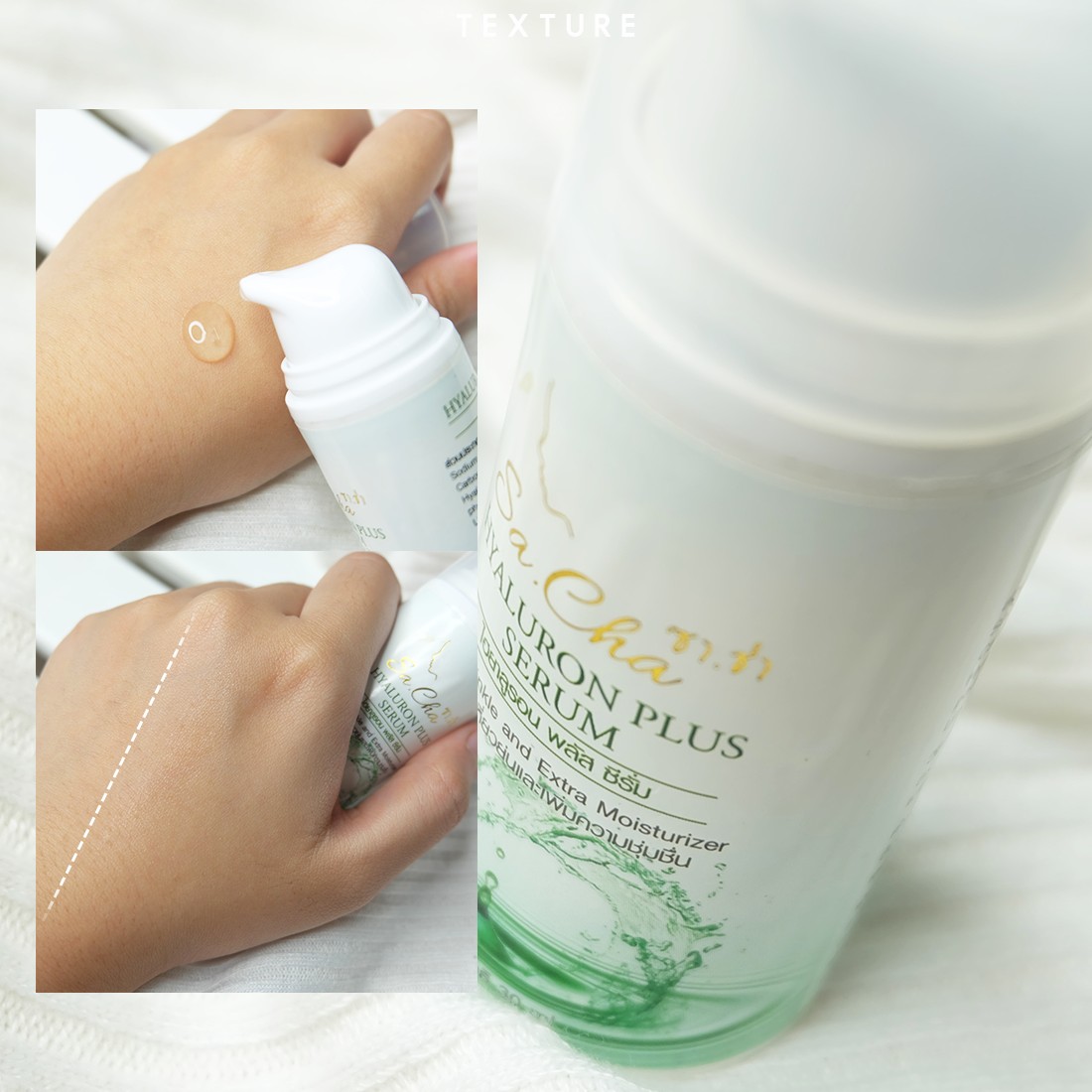 พอปาดแล้วจะกลายเป็นเซรั่มซึมลงสู่ผิวได้ค่อนข้างไว และเหลือฟิล์มความชุ่มชื้นไว้คลุมผิวบางๆ